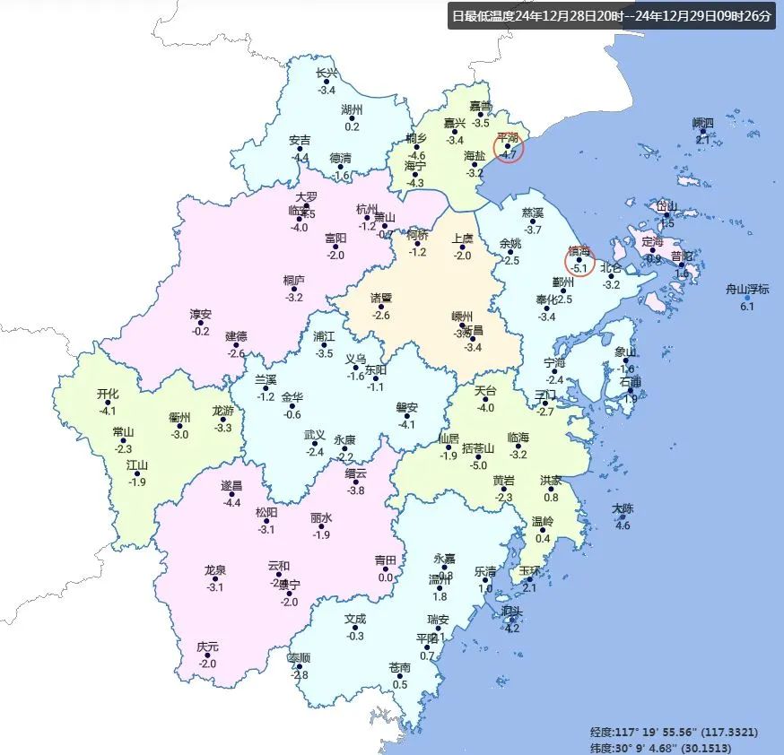 冷空氣疊加晴空輻射作用,今天迎來了12月最冷的一個早晨,我們直接從“冷藏室”搬入了“冷凍室”,全省大部最低氣温在0℃到-5℃,最低的鎮海,在-5.1℃,“凍”感十足。