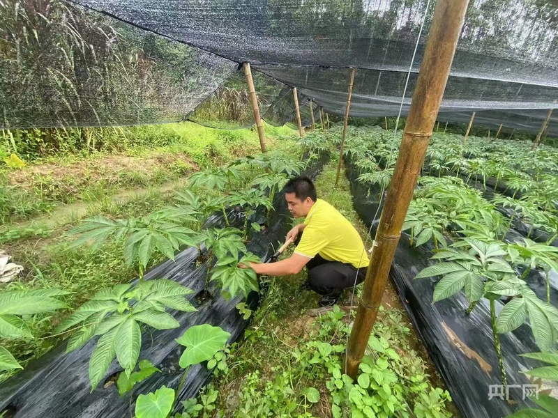 鄭松滔在觀察魔芋生長情況(央廣網發 清遠市退役軍人事務局供圖)