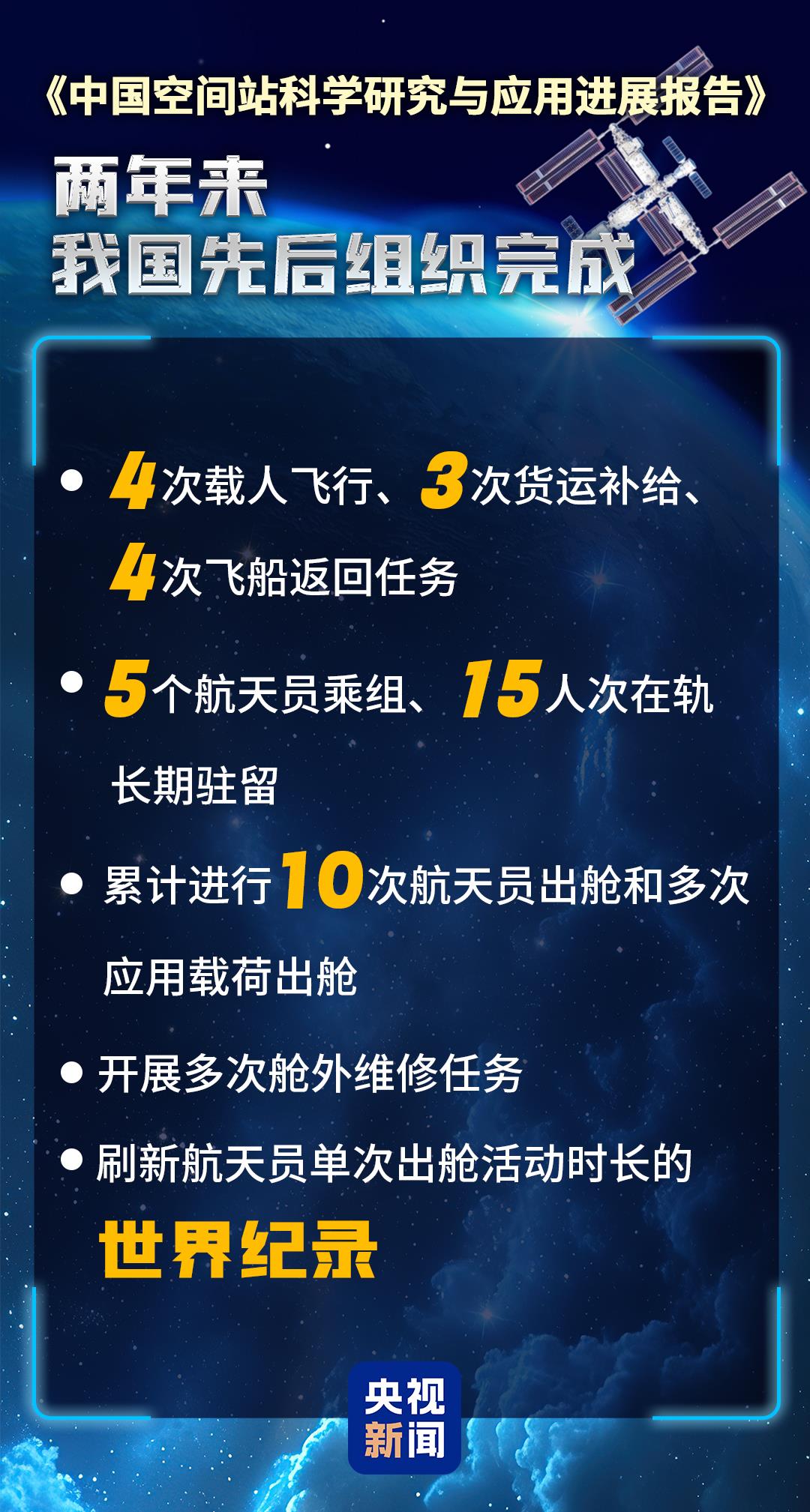 空間站全面建成,標誌着我國成功構建起極具時代特徵與中國特色的載人空間站大系統,標誌着我國載人航天工程圓滿完成三步走戰略目標、進入空間站應用與發展新階段。*兩年來,我國先後組織完成4次載人飛行、3次貨運補給、4次飛船返回任務,5個航天員乘組、15人次在軌長期駐留,累計進行10次航天員出艙和多次應用載荷出艙,開展多次艙外維修任務,刷新航天員單次出艙活動時長的世界紀錄,完成包括2名港澳載荷專家的第四批預備航天員選拔、低成本貨物運輸系統擇優並啓動研製等工作。*目前,中國空間站在軌運行穩定、效益發揮良好。