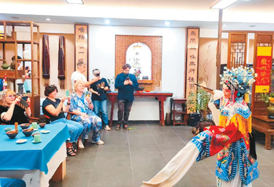 外國遊客在黃山屯蒙學舍體驗徽劇文化。舒少菲攝