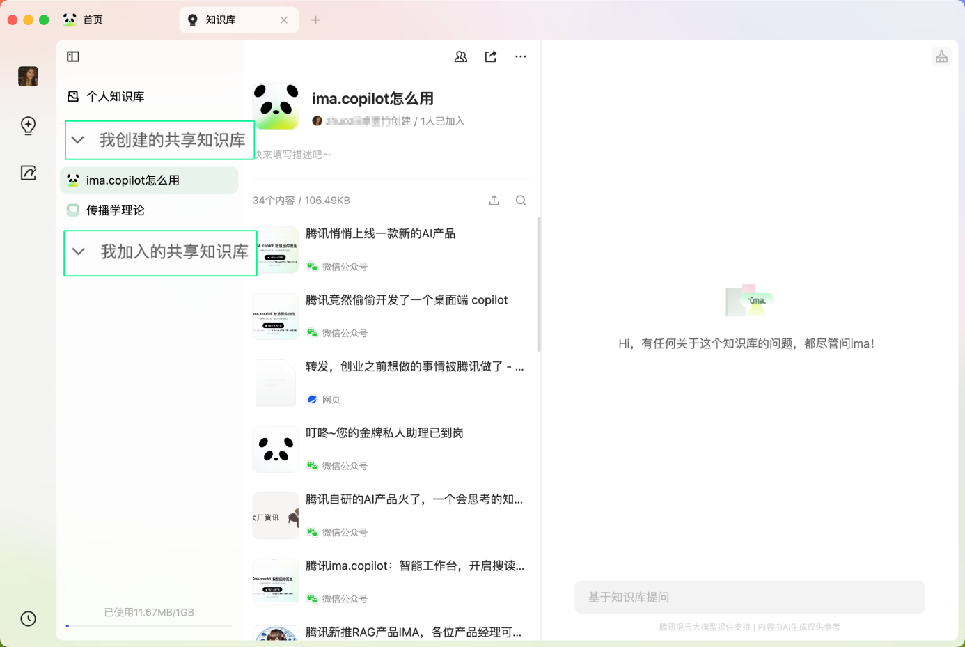 據瞭解,ima“知識庫”增加“共享知識庫”能力,用户可以創建多個知識庫,並把自己創建的知識庫共享給他人,邀請其他成員加入,一起使用知識庫。
