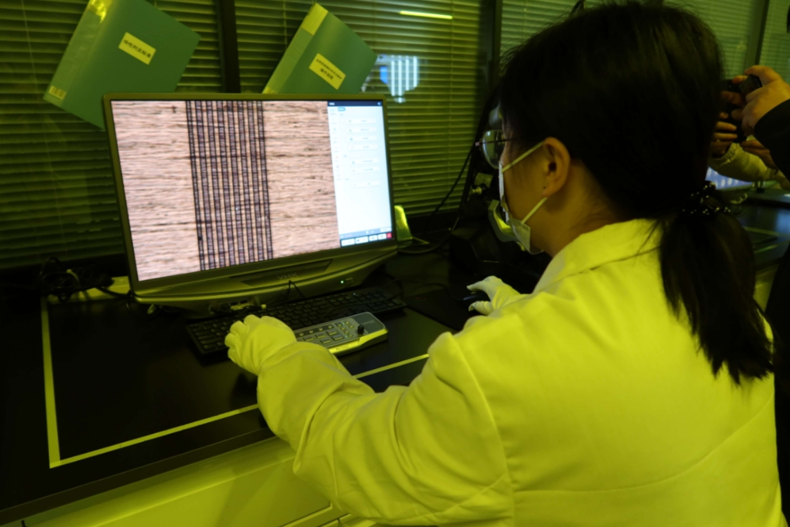 在湖南初源新材料股份有限公司(以下簡稱“初源新材”)研發中心實驗室裏,實驗人員正伏在電腦前,對電路板內的感光幹膜進行質量檢測,通過放大100倍的顯微鏡可以看到,咖色的長條狀物質均勻分佈在電路中,這些便是感光幹膜。