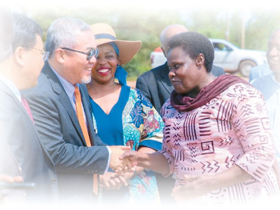 烏干達副總統傑西卡·阿盧波(右一)到訪中烏姆巴萊工業園,與張志剛交談。