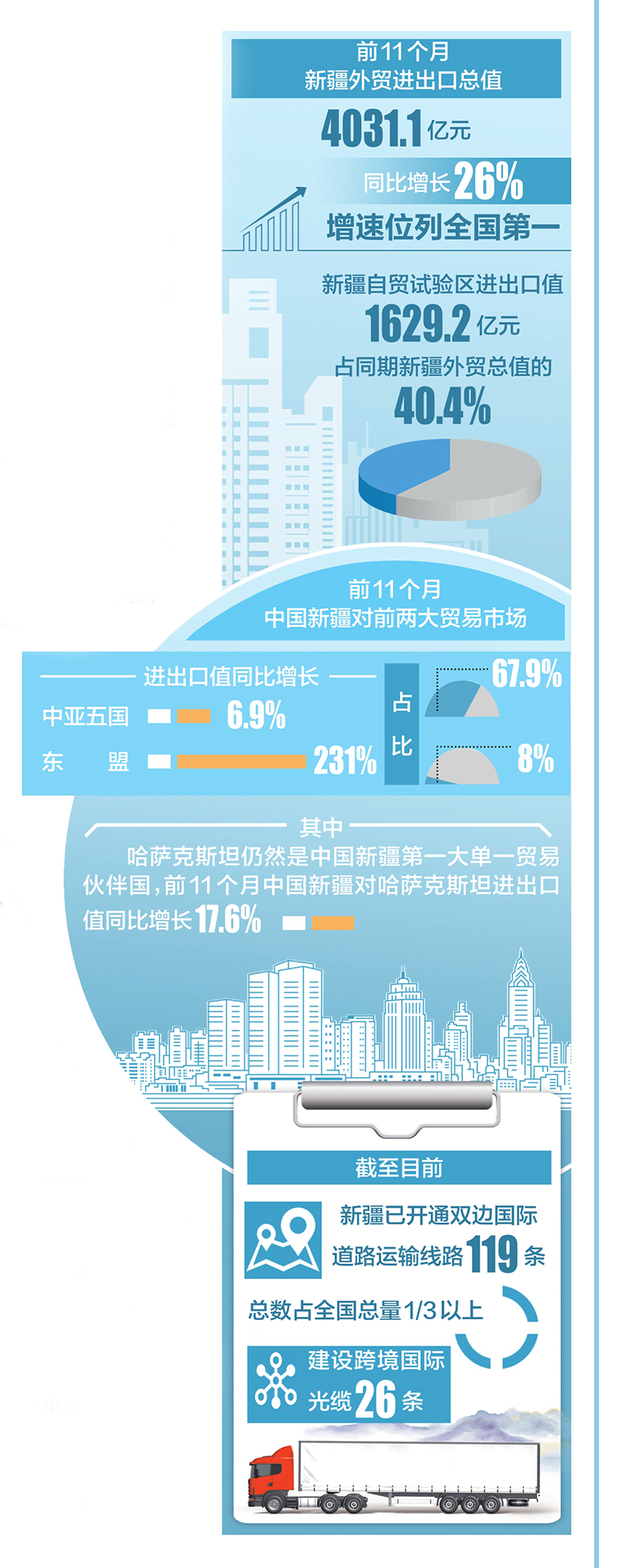 新疆自貿試驗區賦能效應持續顯現。烏魯木齊海關數據顯示,前11個月,新疆自貿試驗區進出口值1629.2億元,佔同期新疆外貿總值的40.4%。