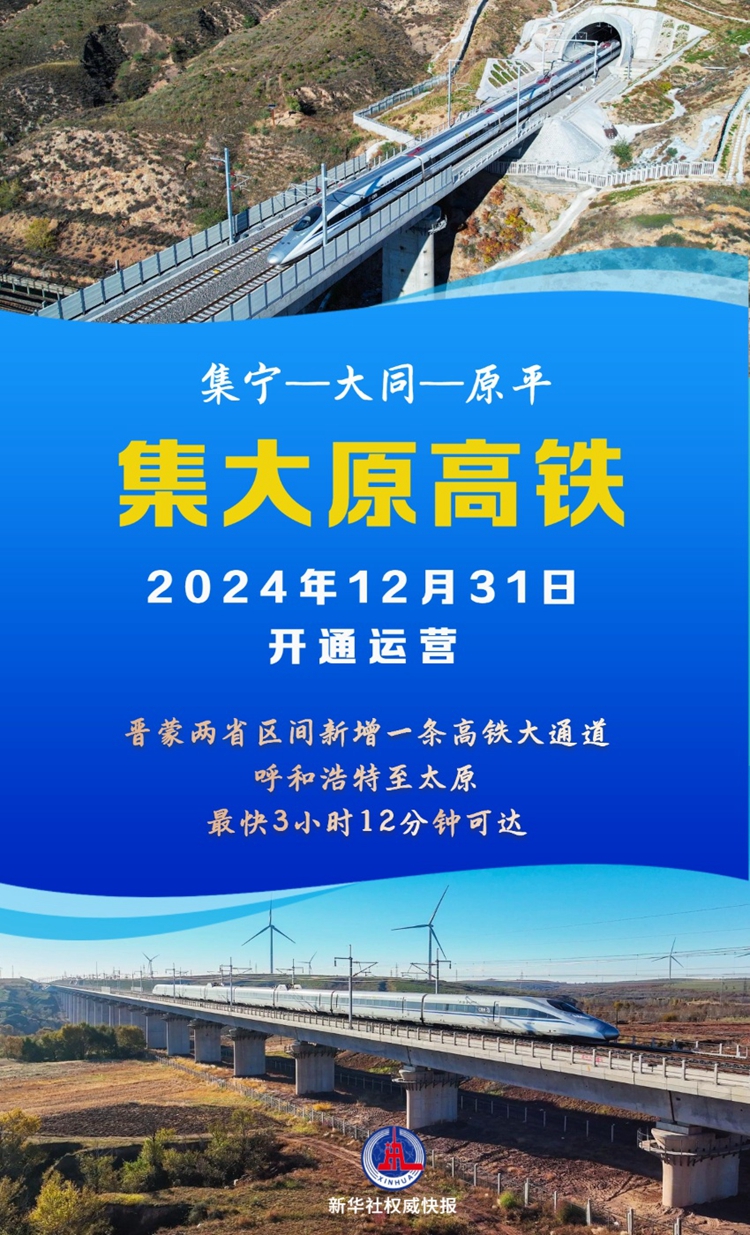 新華社呼和浩特12月31日電(記者朱文哲、許雄)連通內蒙古自治區和山西省的集寧經大同至原平高鐵31日開通運營,烏蘭察布至大同南站最快40分鐘可達,呼和浩特東至太原南站最快3小時12分鐘可達,晉蒙兩省區間新增一條高鐵大通道。