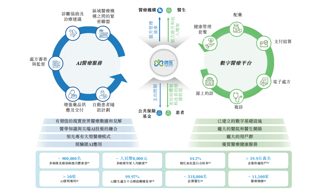 表現在技術和服務上,微醫控股擁有行業領先的自研醫療大模型,以及AI醫生、AI藥師、AI健管、AI智控等AI應用。自2020年開始,微醫控股在天津市率先成立了數字健共體,併為健共體內包括患者、醫療機構、公共醫療保險基金在內的成員提供AI醫療健康解決方案。通過AI賦能的整合型醫療服務模式,微醫控股成功提升了成本效益和會員忠誠度,促進業務快速增長,為基層醫療機構和公共醫療保險基金帶來切實收益。