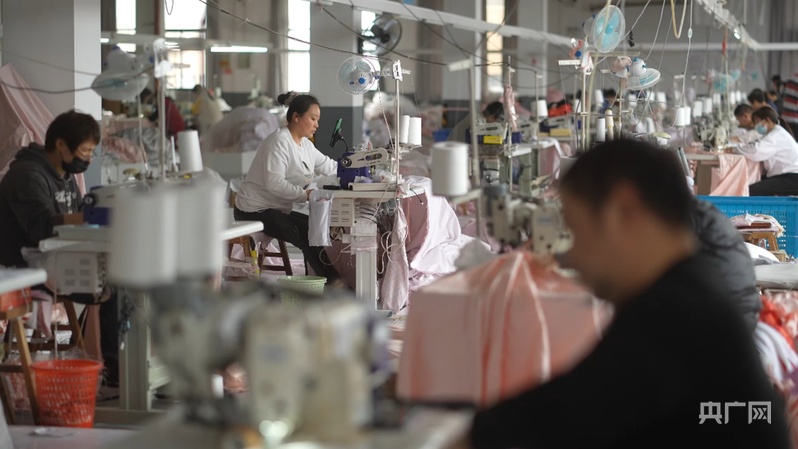 家紡企業車間裏,工人在生產線上忙碌(央廣網記者 楊夢奎 攝)