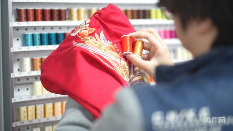 家紡企業內,設計師在眾多繡花線中選色(央廣網記者 王姝姝 攝)