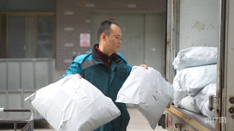 於雷正在企業廠區收取快遞件(央廣網記者 楊夢奎 攝)