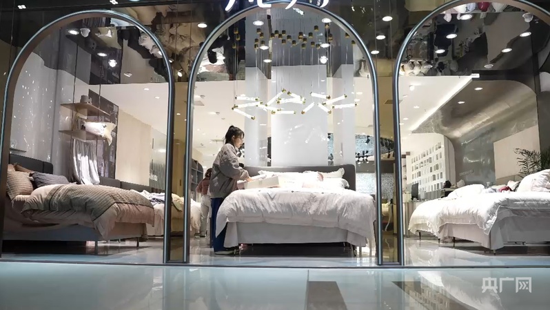 疊石橋家紡城內店員整理家紡產品(央廣網記者 楊夢奎 攝)