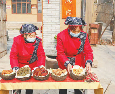 泡豆、磨豆、潑沫……為保護非遺,村裏建起各式各樣的手工坊,牆上畫着北莊豆腐的製作過程,吸引遊客“打卡”拍照;當地村民還演示“漏粉條”,展示“平山醃肉”,為遊客講述“舌尖上的北莊”,不斷豐富旅遊體驗。