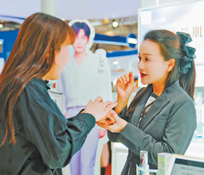 第七屆進博會期間,參觀者在花王展台體驗相關產品。