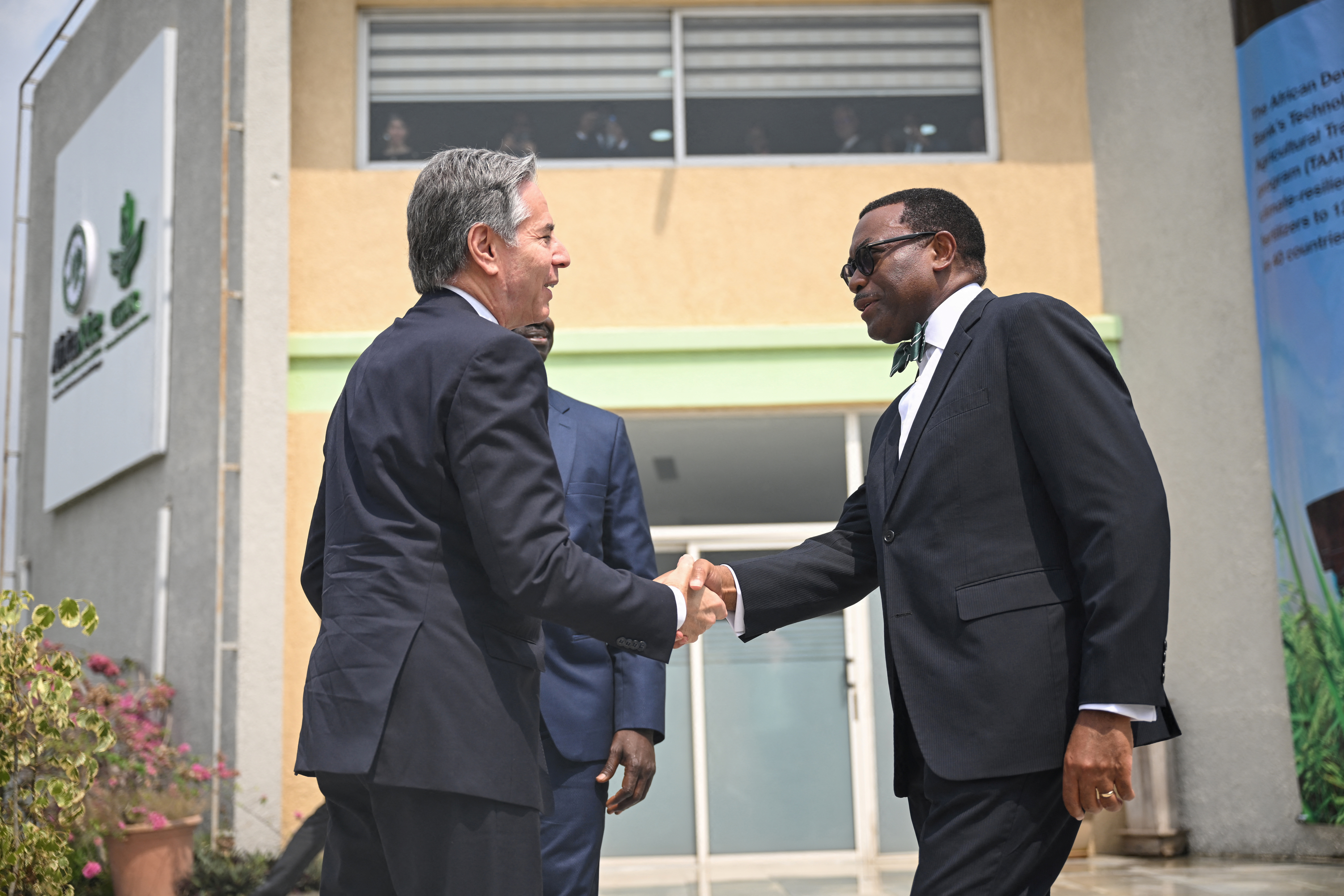 非洲開發銀行集團總裁阿金沃米·阿德西納(Akinwumi Adesina)在2024年1月23日在科特迪瓦阿比讓的非洲稻米總部歡迎美國國務卿安東尼·布林肯。 安德魯·卡巴列羅-雷諾茲/路透社攝