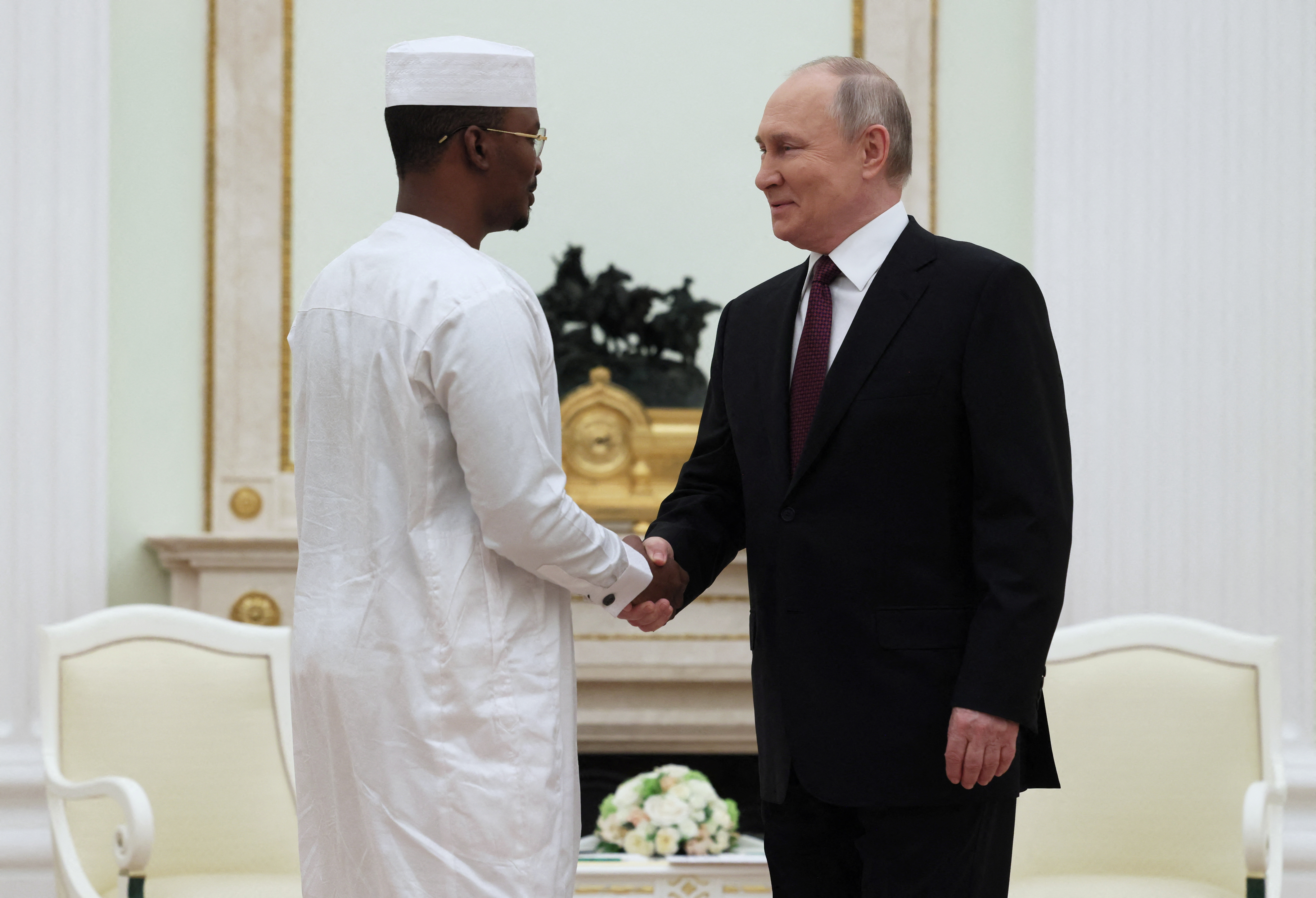 俄羅斯總統弗拉基米爾·普京與乍得臨時總統馬哈馬特·伊德里斯·代比在莫斯科克里姆林宮會晤,2024年1月24日。斯普特尼克/米哈伊爾·梅策爾/俄羅斯路透社/泳池照片