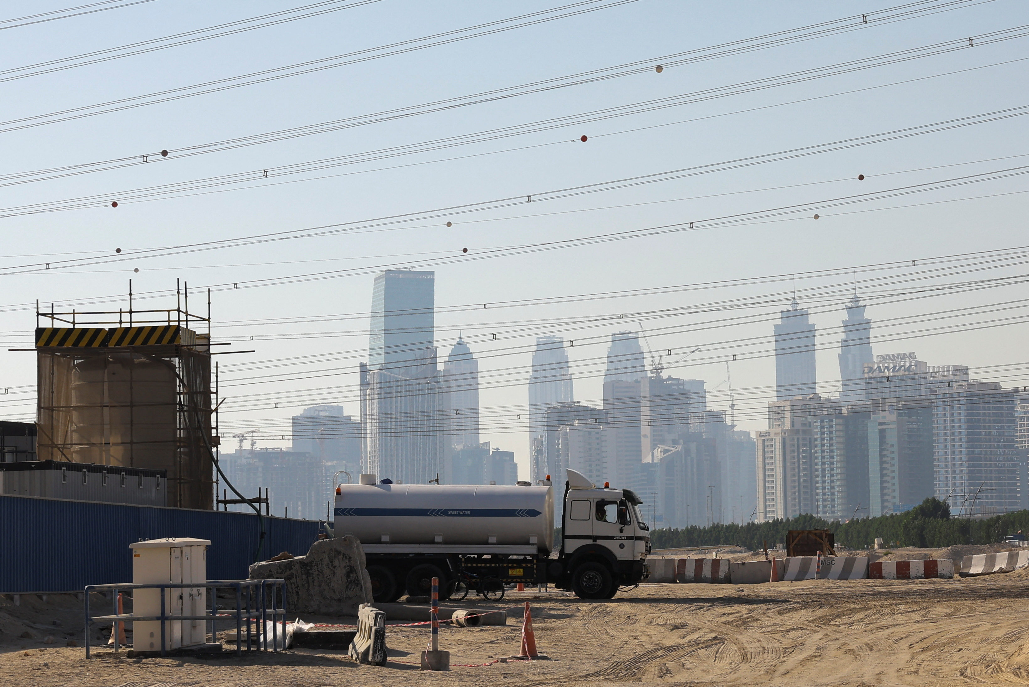 一個建築工地,遠處是迪拜的天際線,包括哈利法塔在內,迪拜,阿拉伯聯合酋長國,2024年1月24日。路透社/Amr Alfiky