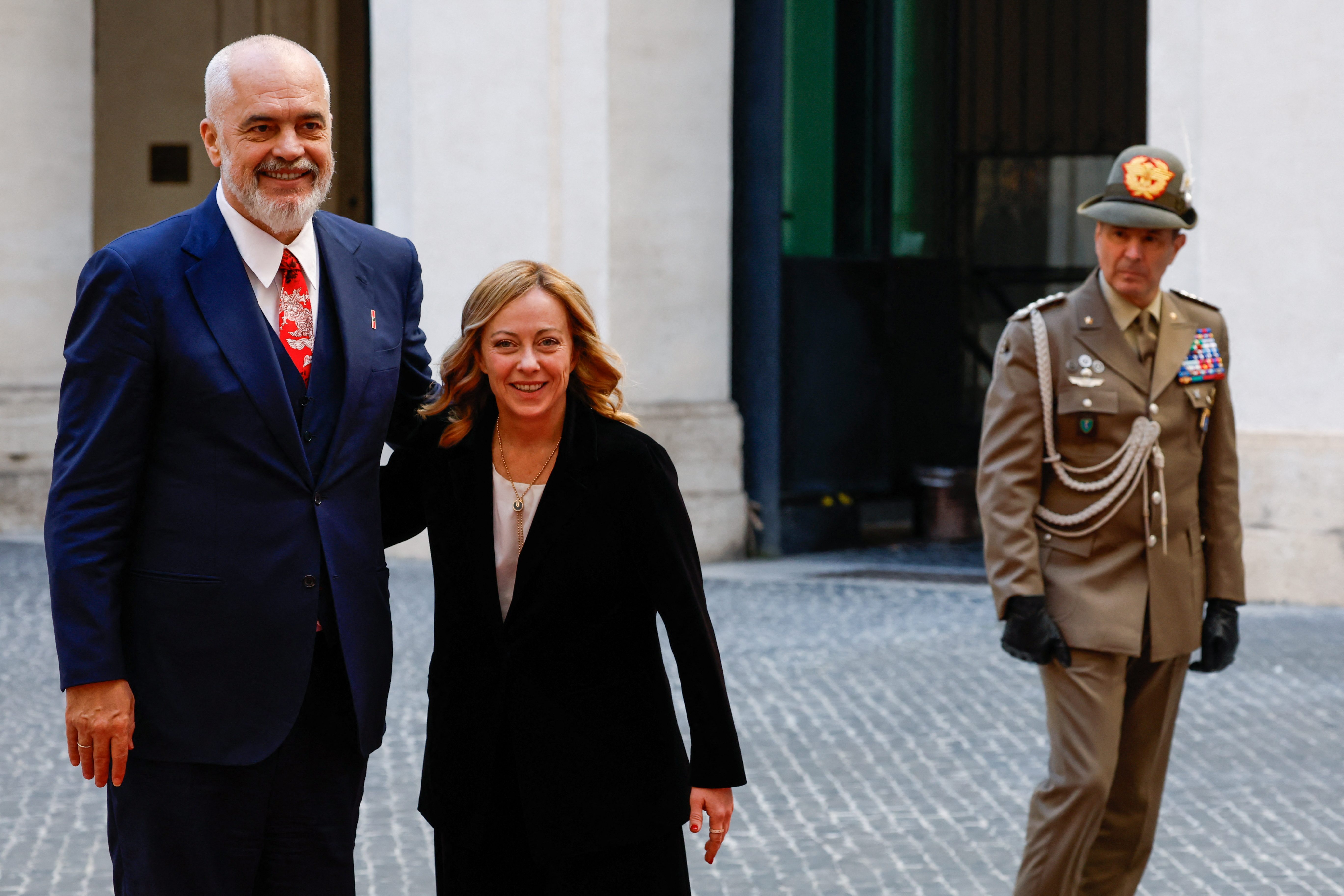 意大利總理喬爾吉亞·梅洛尼和阿爾巴尼亞總理埃迪·拉馬在羅馬基吉宮會面,2023年12月16日。路透社/雷莫·卡西利/檔案照片