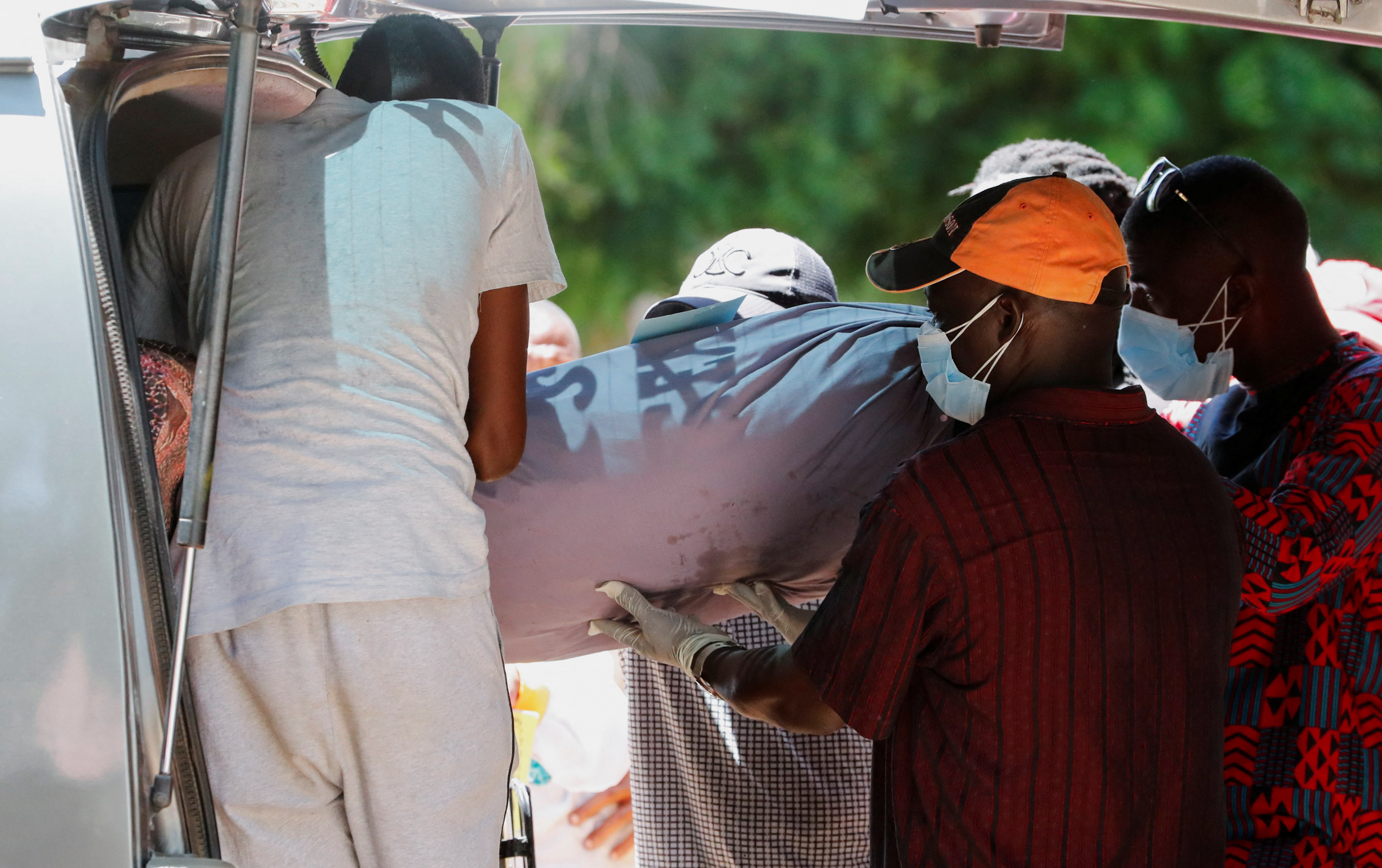 第1/5項 親屬們卸下埃斯特·比里亞·瑪莎(Esther Biriya Masha)的遺體,她是基督教邪教“好消息國際教會”的信徒,他們相信如果餓死自己就能上天,在肯尼亞基裏菲縣馬林迪的星專科醫院殯儀館,當局開始將遺體交還給家屬,從一輛私人靈車上卸下,2024年3月26日,攝影:REUTERS/Thomas Mukoya