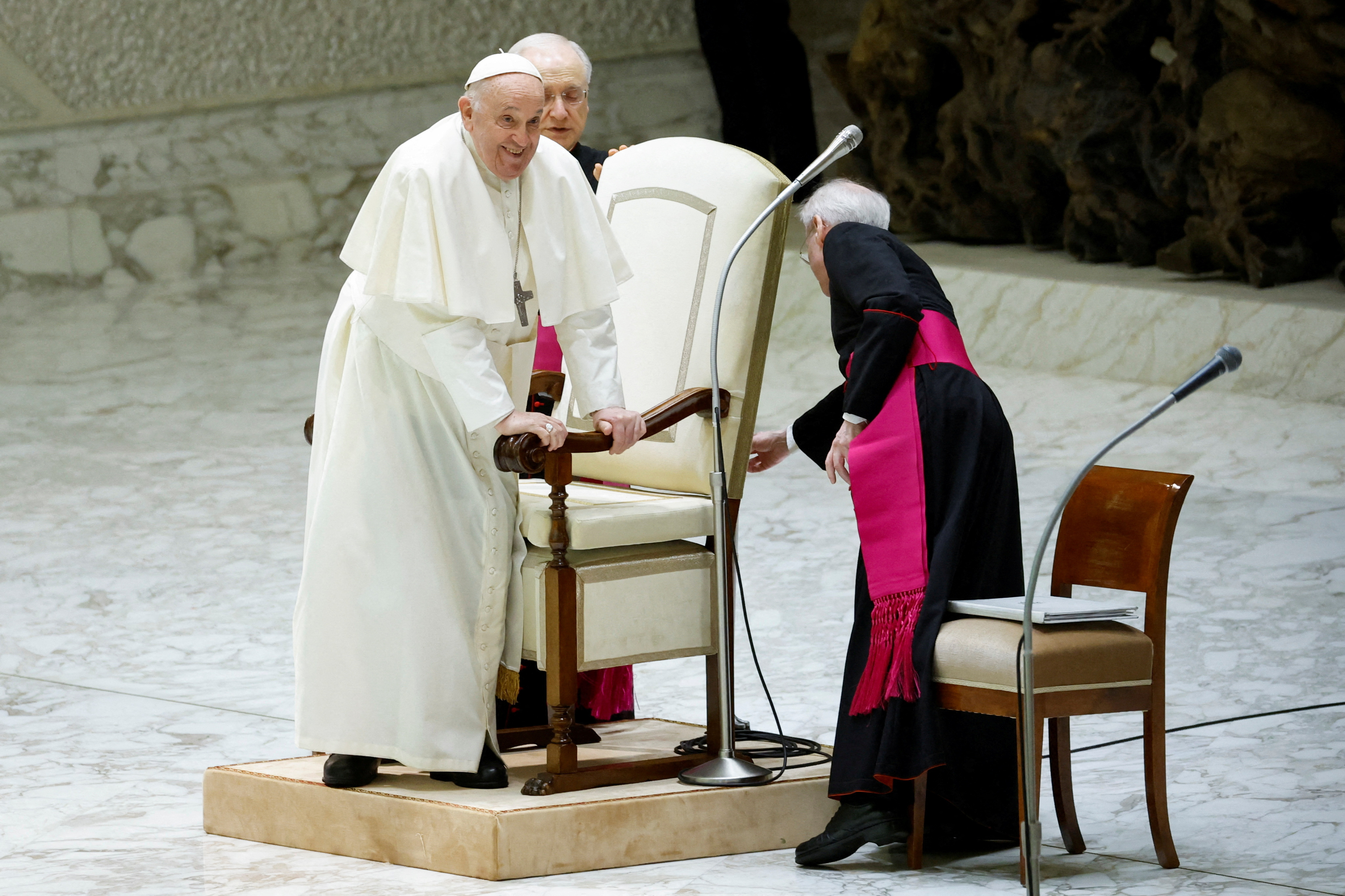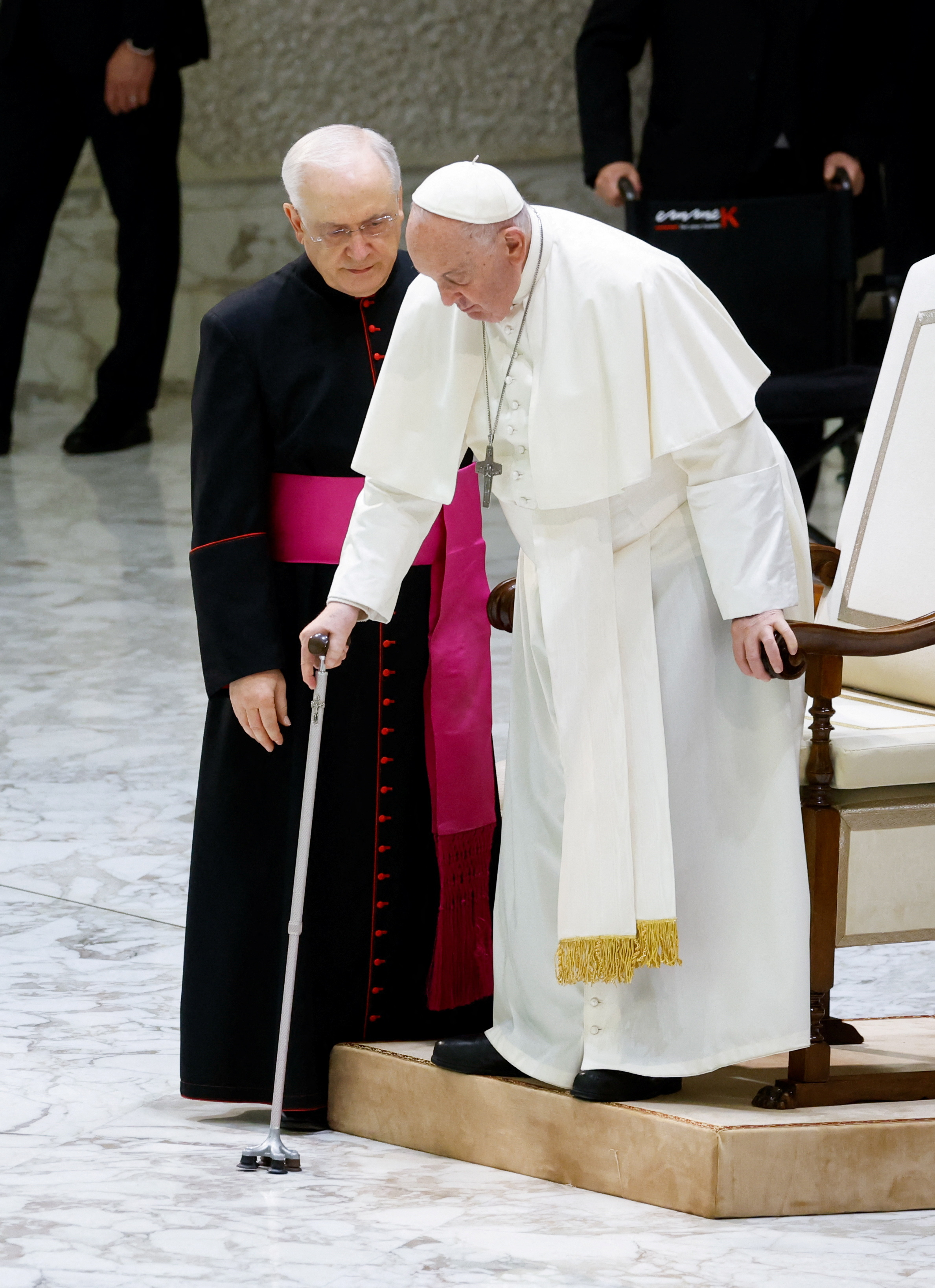 弗朗西斯因膝蓋問題也行動不便,週三抵達保祿六世觀眾大廳時,他拄着枴杖走路,而不是他有時使用的輪椅。