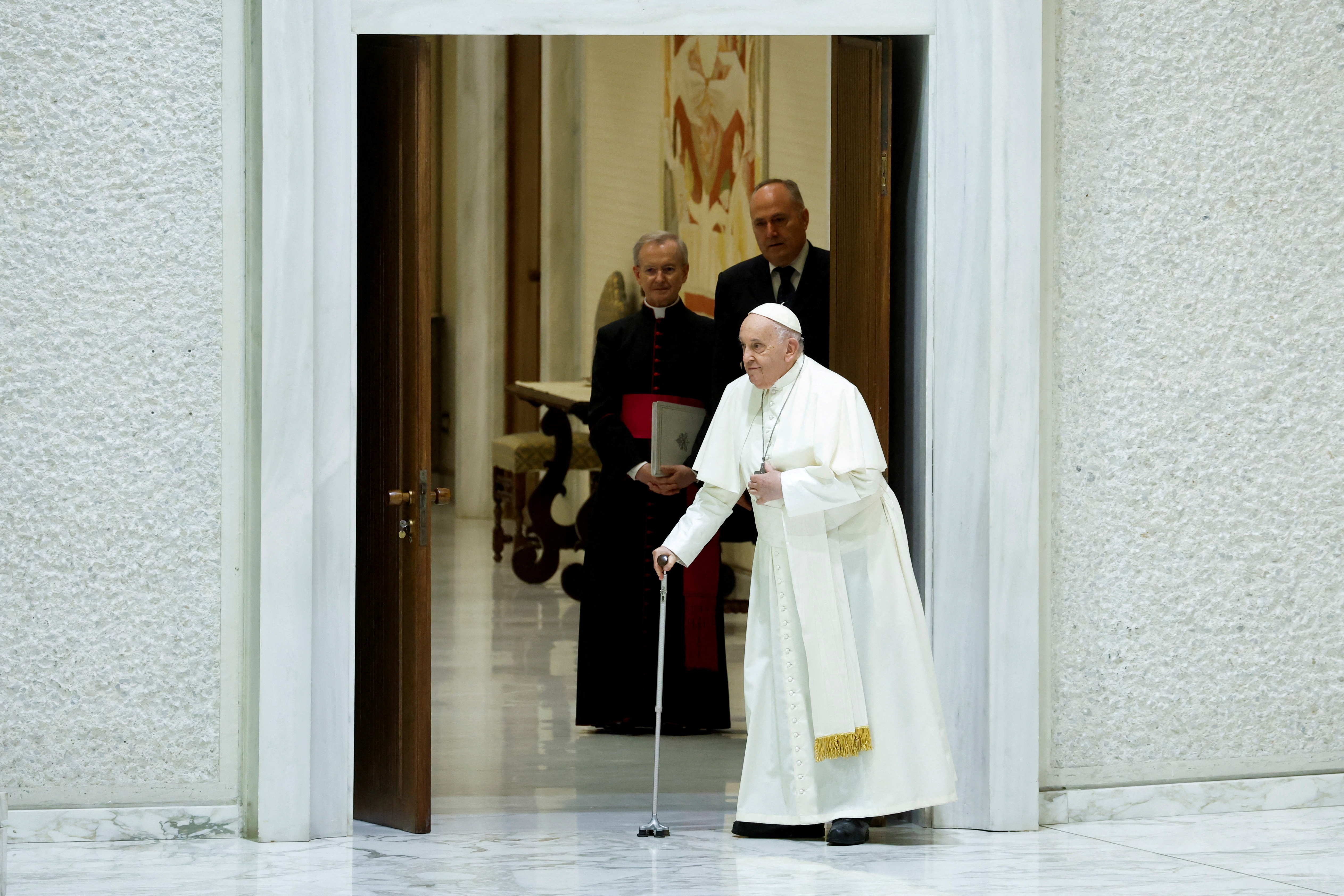 弗朗西斯因膝蓋問題也行動不便,週三抵達保祿六世觀眾大廳時,他拄着枴杖走路,而不是他有時使用的輪椅。