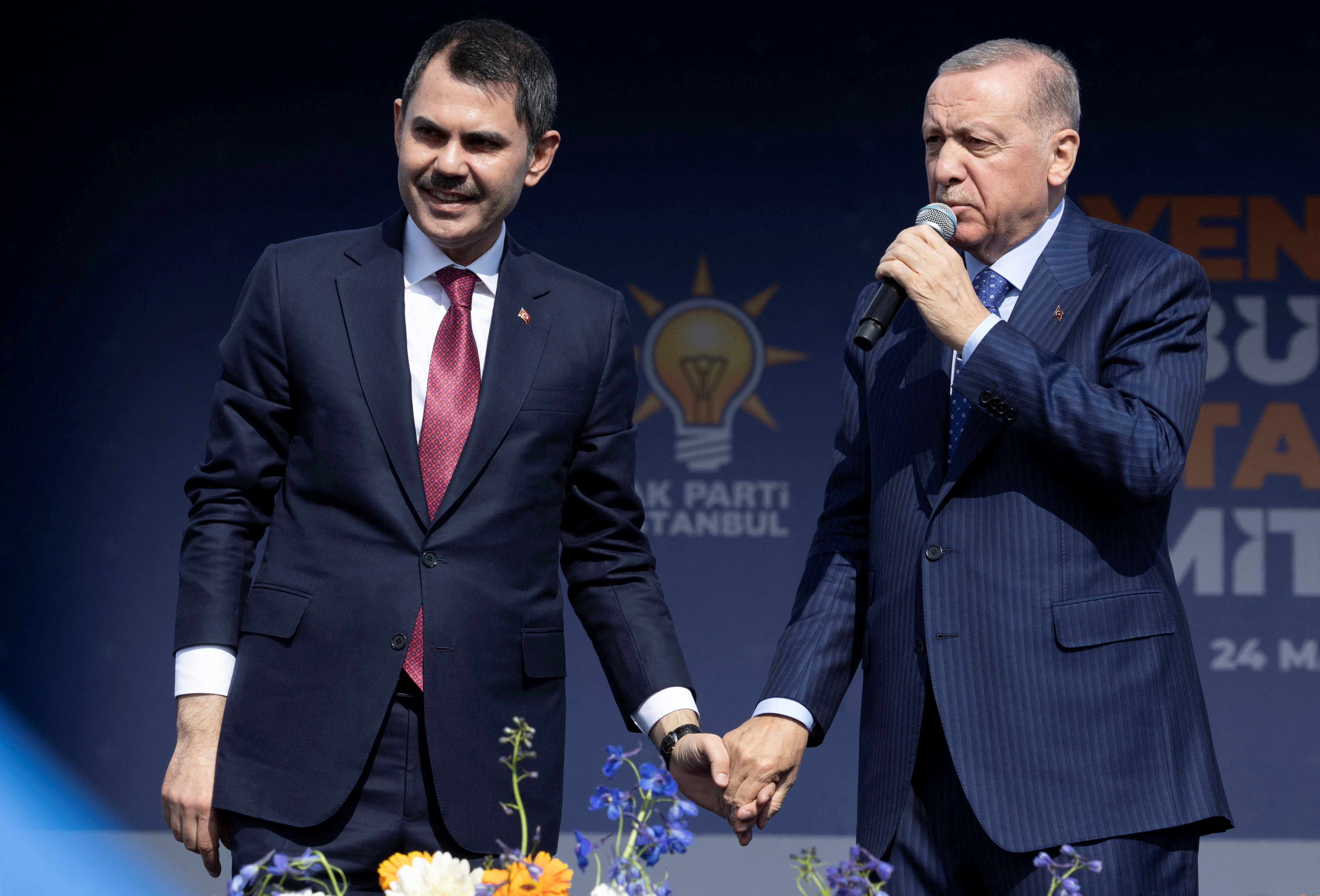 第1張圖片 土耳其總統雷傑普·埃爾多安和他所在的執政黨(AKP)候選人穆拉特·庫魯姆在2024年3月24日伊斯坦布爾市地方選舉前的集會上握手。路透社/烏米特·貝克塔斯/文件照片
