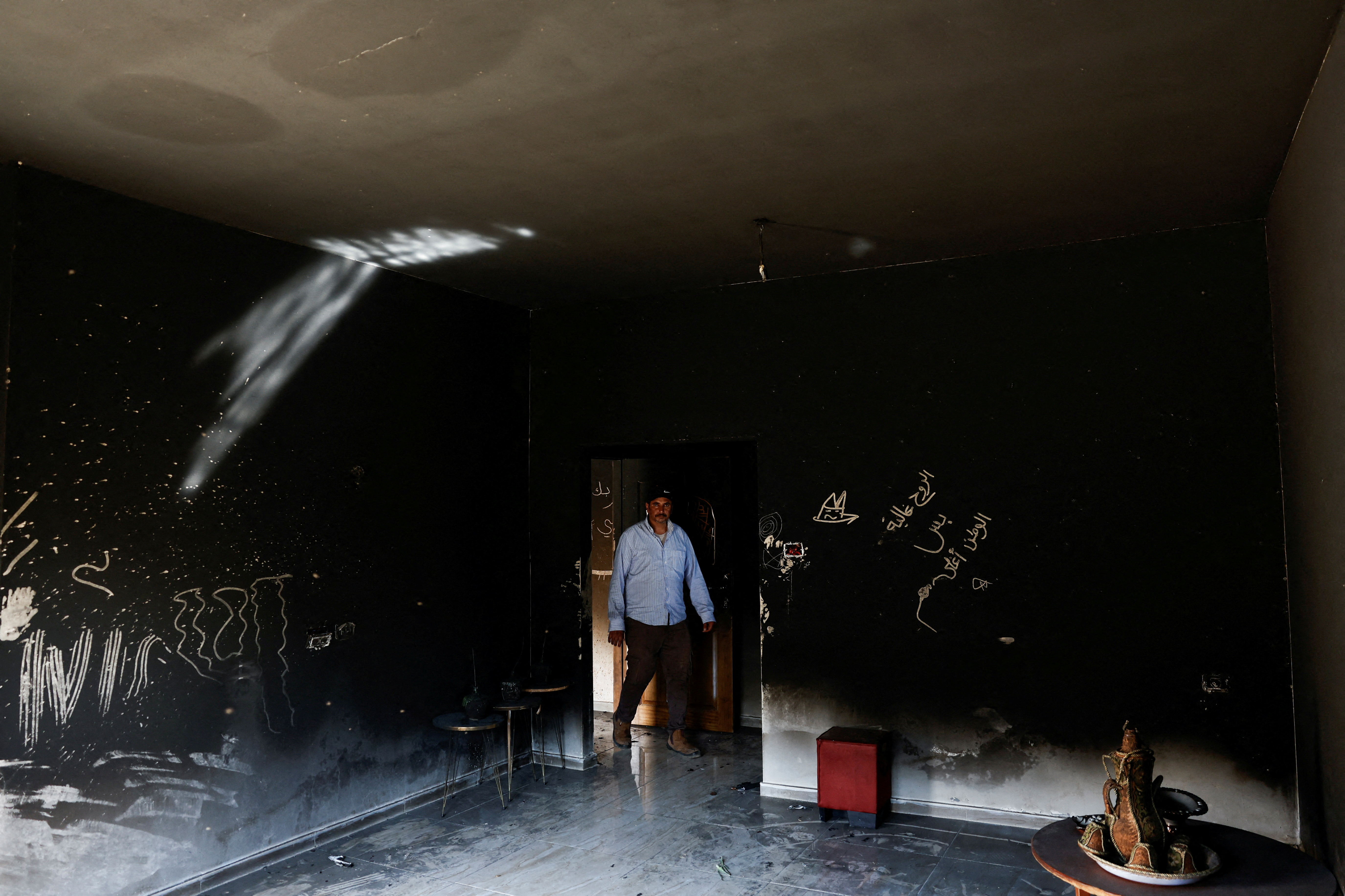 在襲擊中他的家被縱火,Shehadah Abu Rasheed 搭起了帳篷以提供臨時庇護。屋內,牆壁被燒得漆黑一片。Abu Rasheed 説他的妻子被定居者打傷,他的四個孩子中有一個輕微受傷。