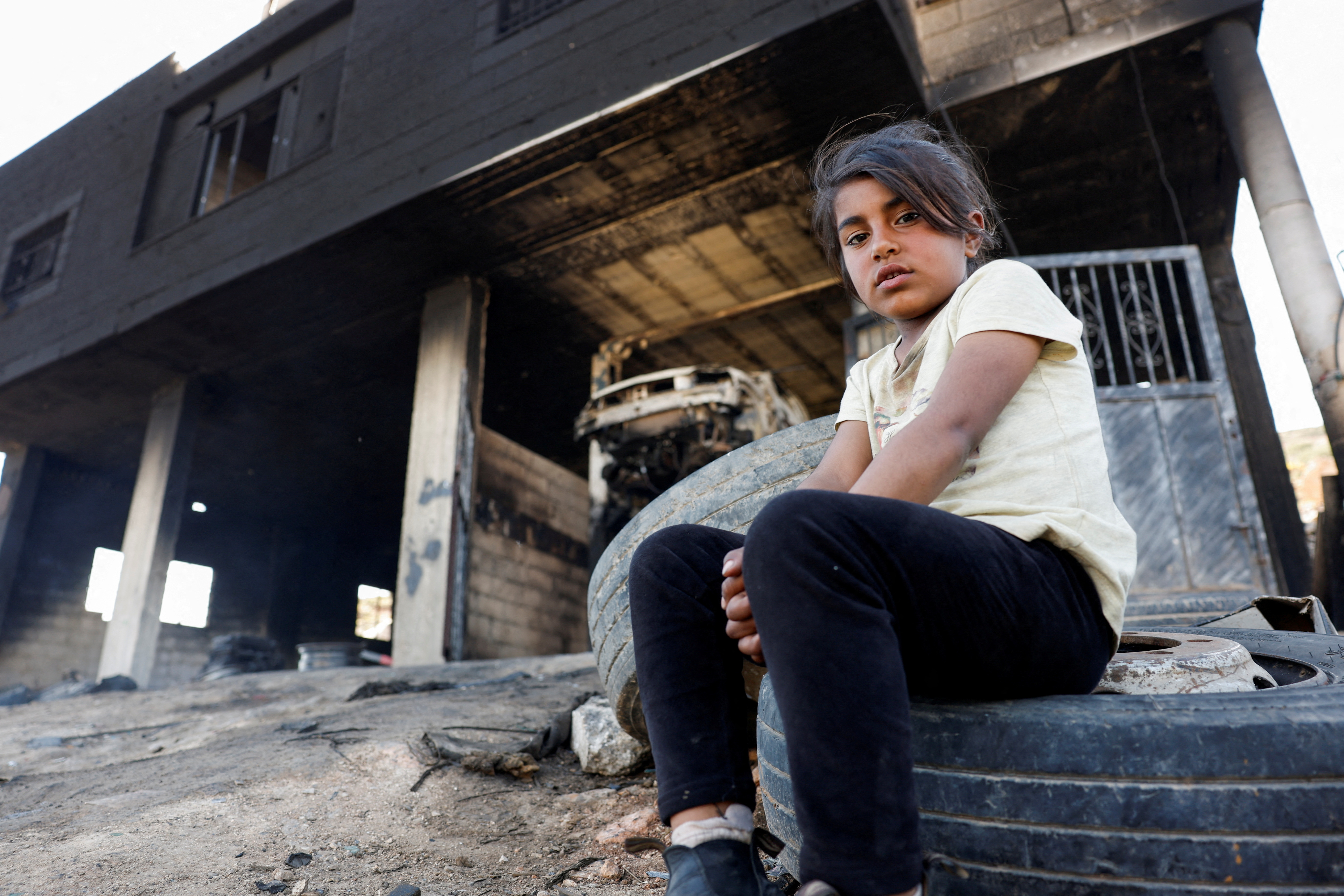 第1項,共5項 一名巴勒斯坦女孩坐在她的房子前,經過以色列定居者襲擊了阿爾穆蓋耶爾村,地點在以色列佔領的西岸,2024年4月17日。路透社/穆罕默德·託羅克曼/檔案照片