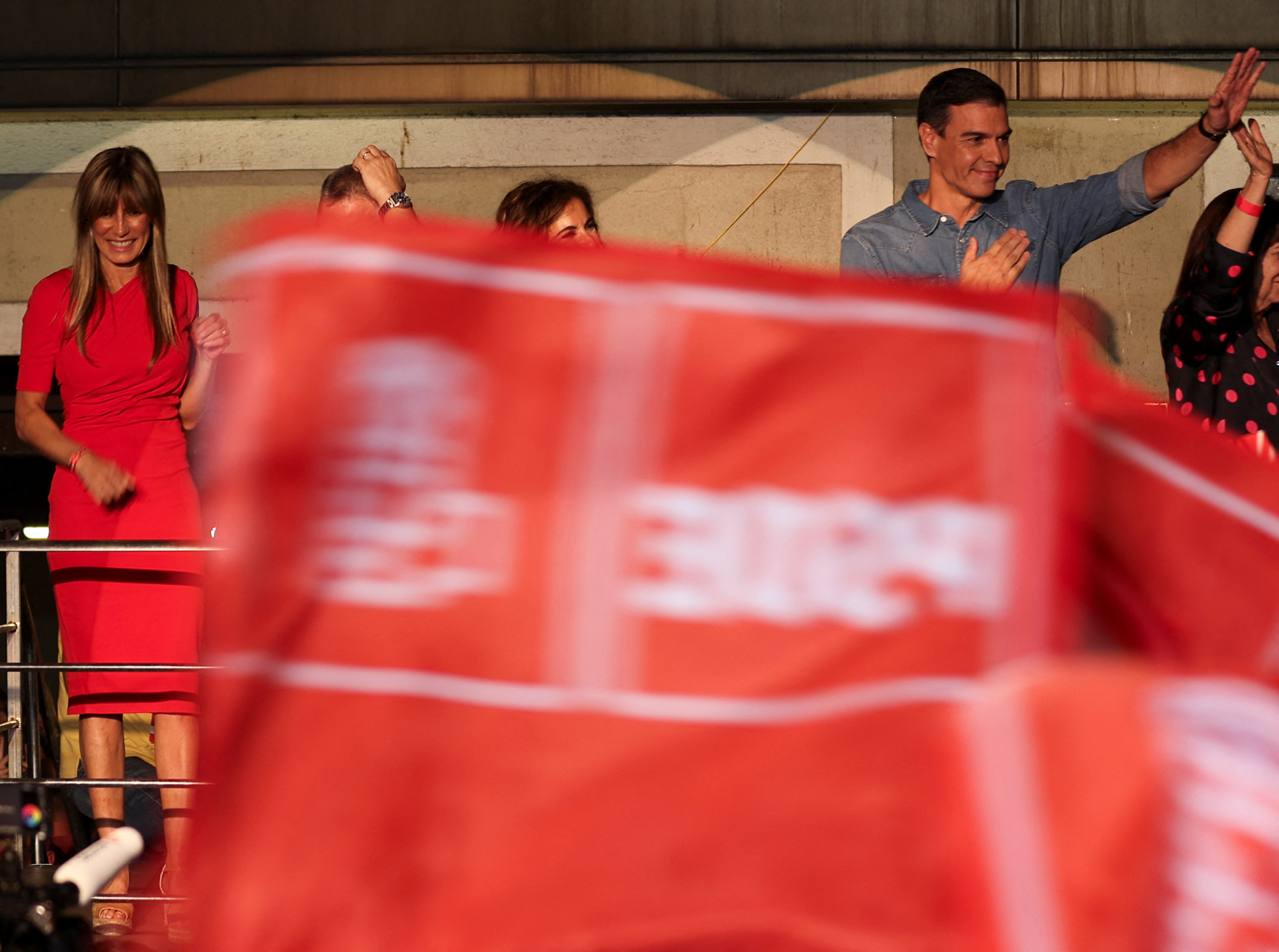2項中的第1項 西班牙社會黨領袖兼總理佩德羅·桑切斯與妻子貝戈娜·戈麥斯一同出席2023年7月23日在西班牙馬德里舉行的大選時向支持者講話。路透社/Nacho Doce