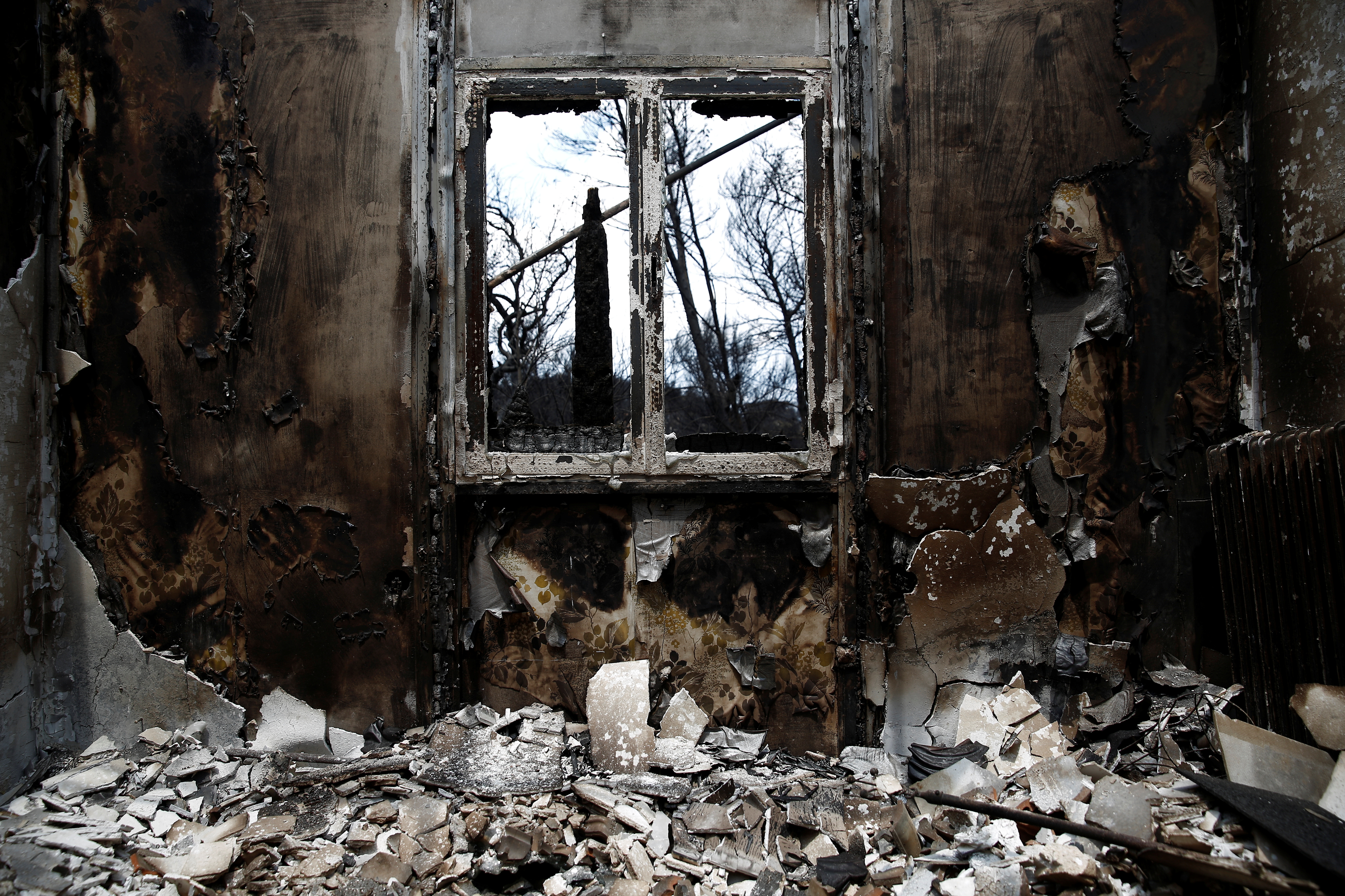 2 件物品中的第 1 件 在希臘雅典附近的馬蒂村發生野火後,看到一座被燒燬的房屋內部,2018 年 7 月 28 日。路透社/科斯塔斯·巴爾塔斯/檔案照片