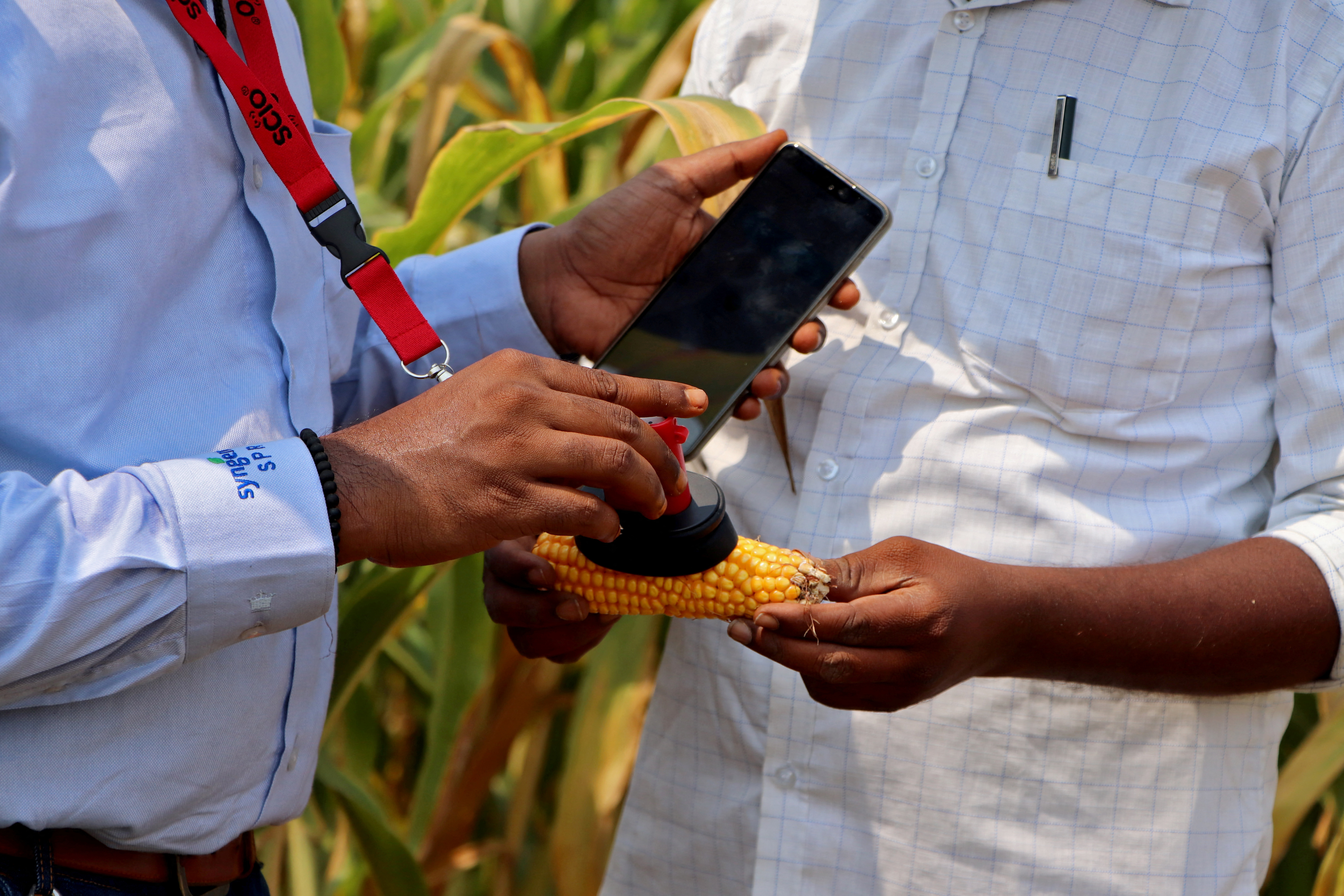 第1項,Syngenta的員工使用一台含水量計設備檢查玉米是否已經成熟,這是在印度安得拉邦克里希納區的玉米田裏進行的,時間是2024年4月1日。路透社/阿爾瑪斯·馬蘇德