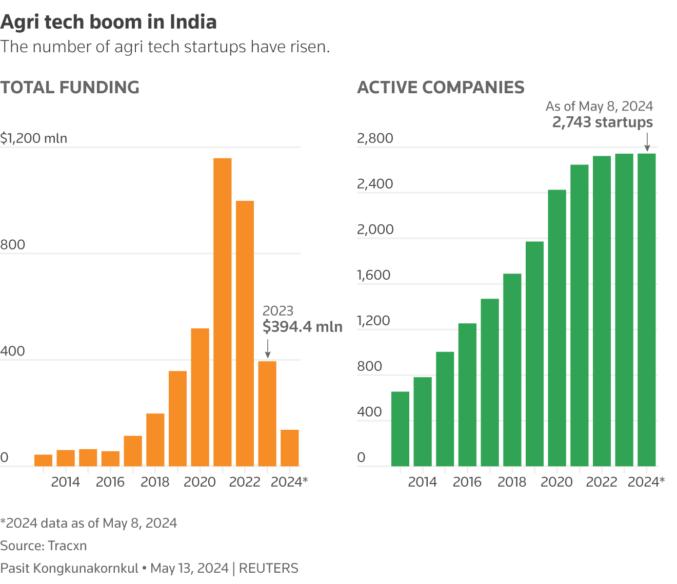 左右兩側的條形圖顯示了2013年至2024年間印度農業科技初創公司的總融資額和活躍農業科技初創公司的數量。