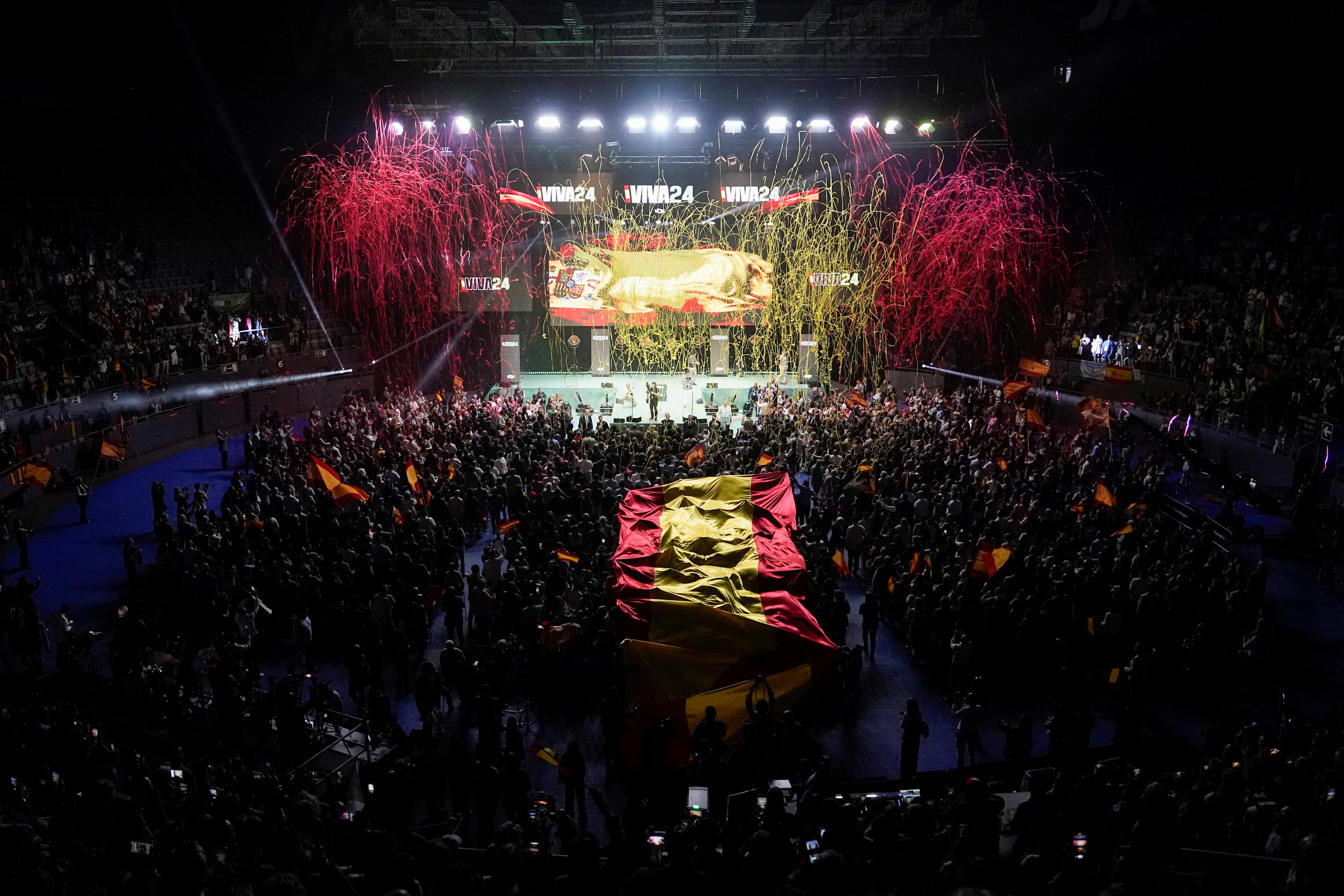 根據Vox的説法,將近11,000名支持者擠滿了一座前鬥牛場,揮舞着數百面西班牙國旗,以及一些阿根廷、古巴、委內瑞拉和以色列的國旗。