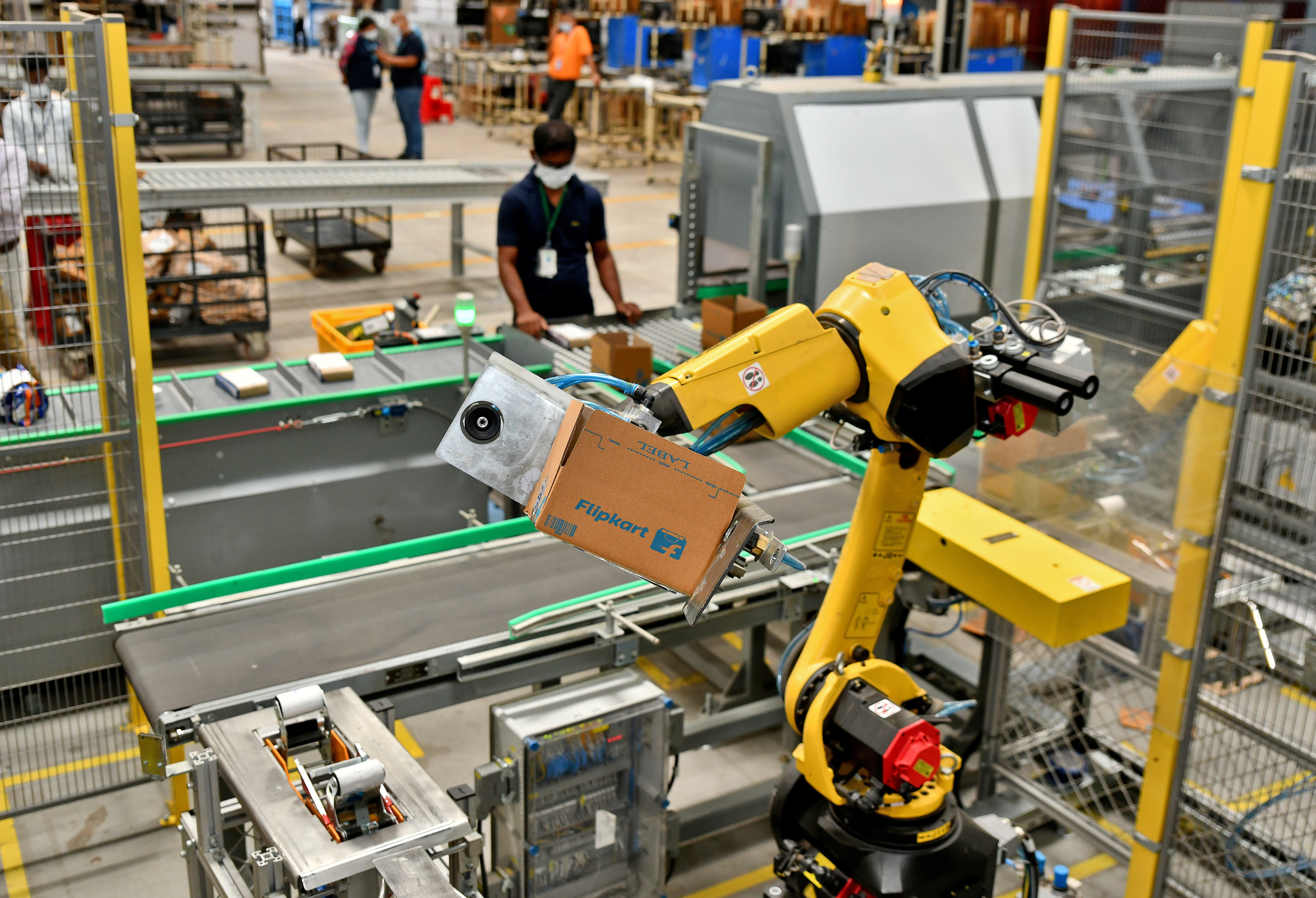 一個機械手臂在印度班加羅爾郊外的Flipkart一家領先的電子商務公司的履行中心組裝紙盒以包裝商品,2021年9月23日。路透社/塞繆爾·拉傑庫馬/文件照片 班加羅爾,5月24日(路透社) - 谷歌的母公司Alphabet (GOOGL.O)將以3.5億美元的價格收購沃爾瑪支持的Flipkart的少數股權,估值為370億美元,一位知情人士告訴路透社。谷歌和Flipkart目前無法立即確認投資價值。