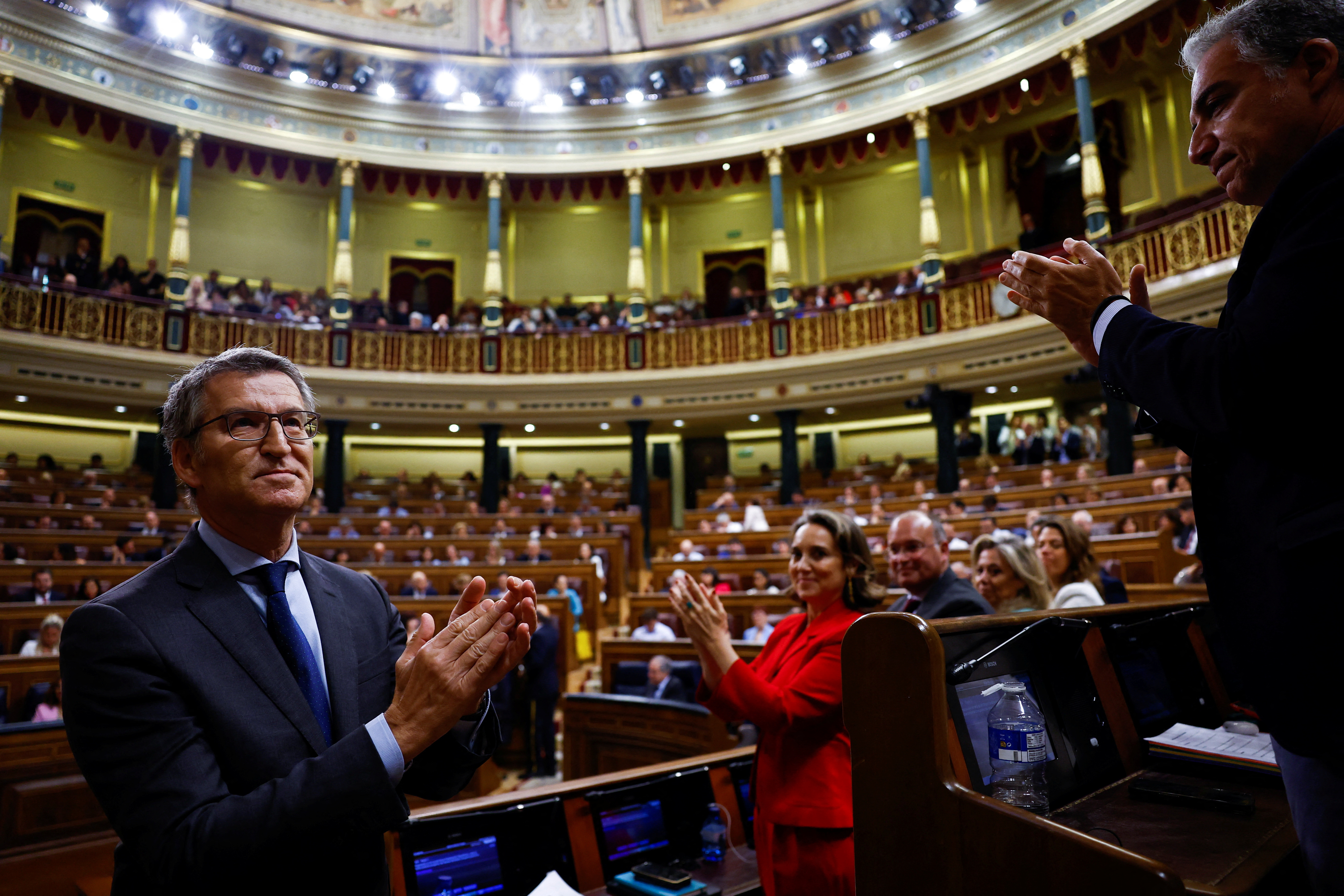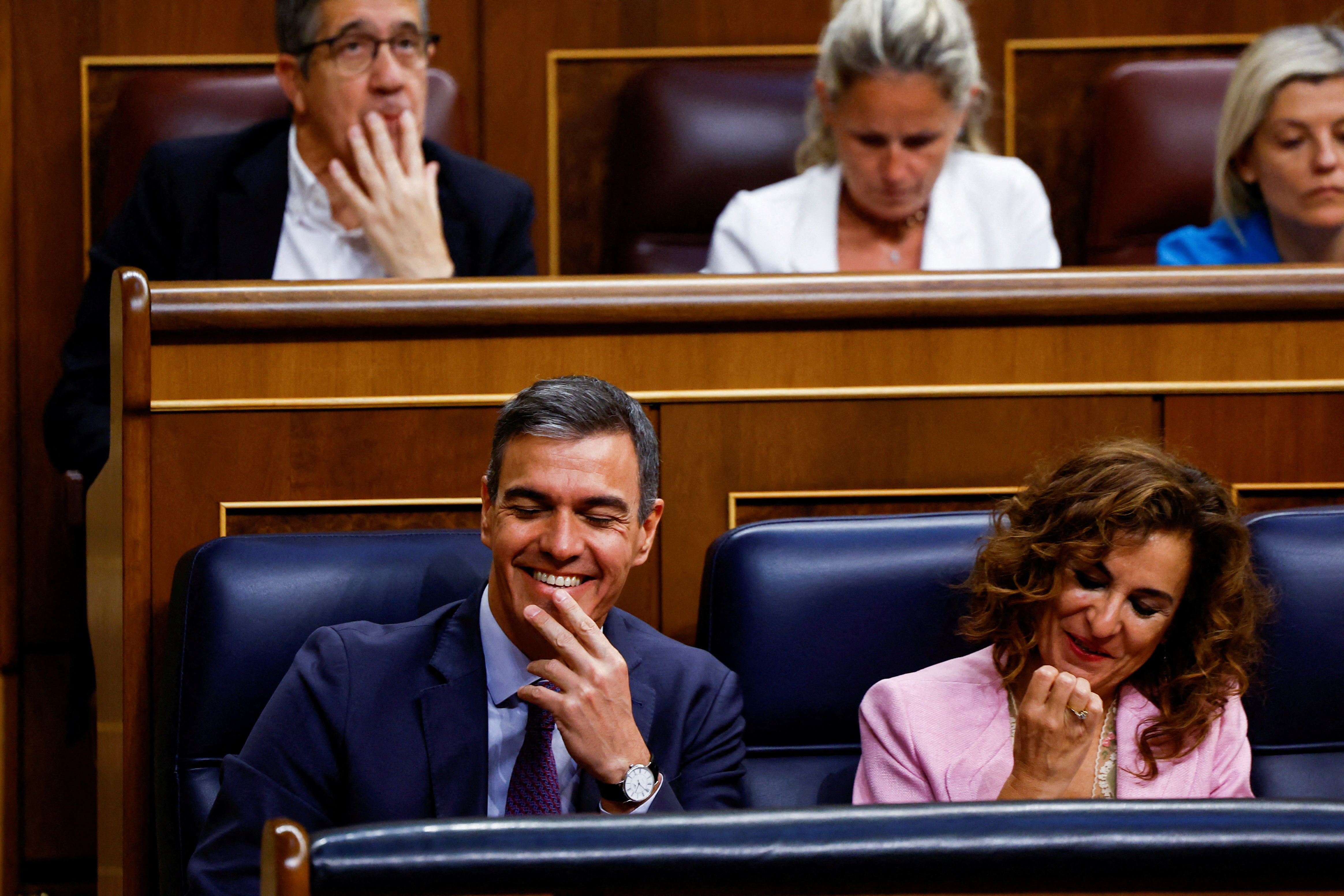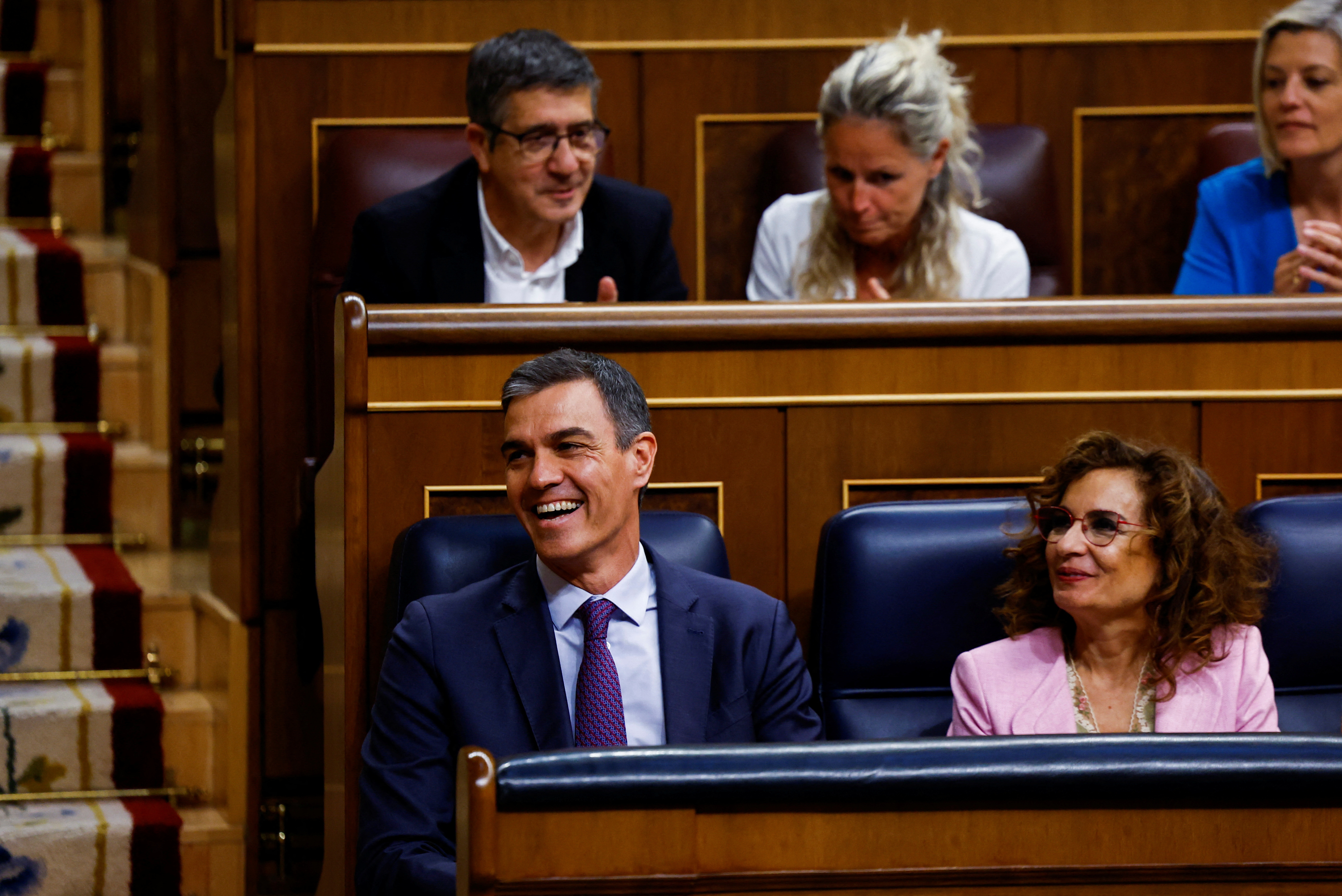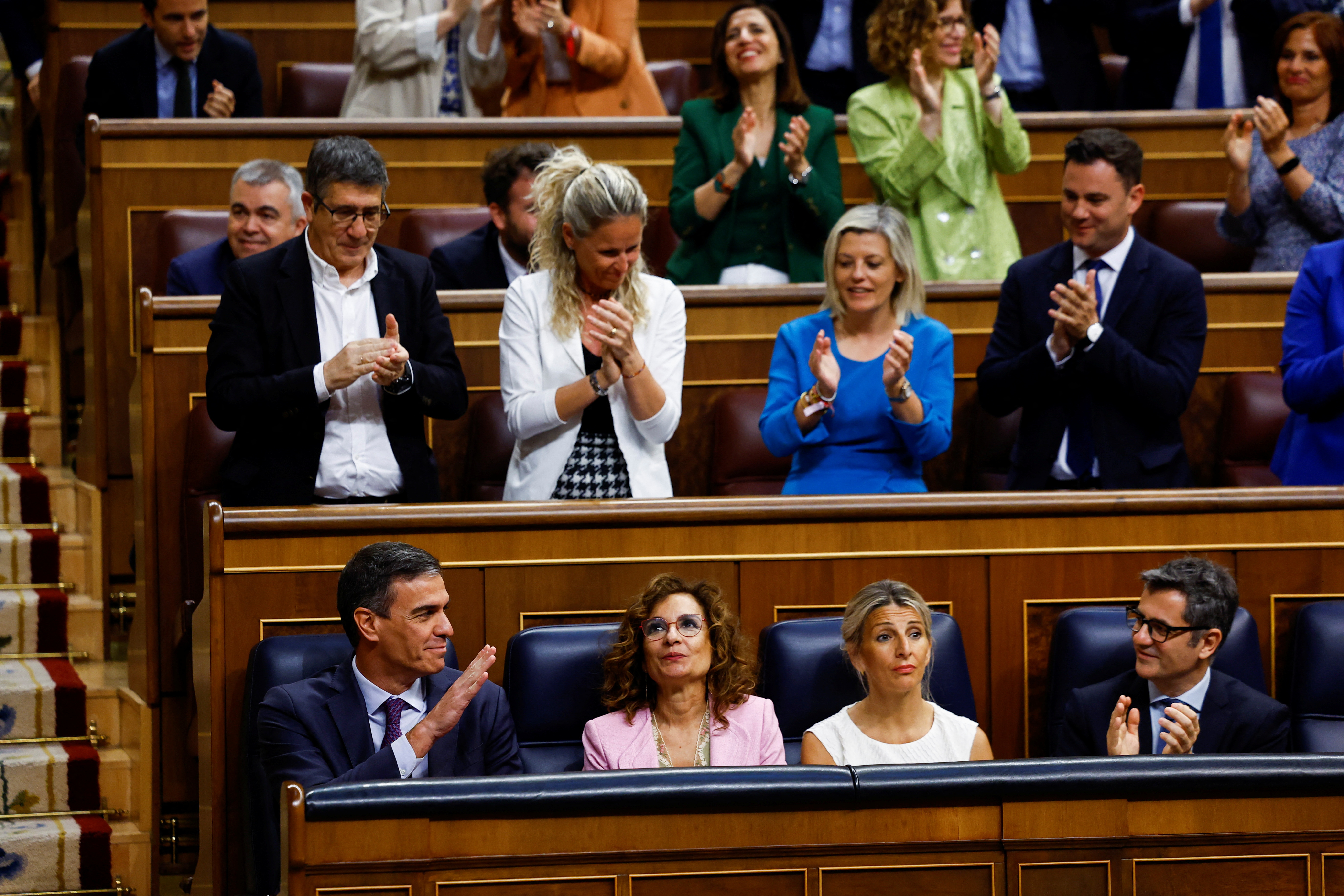 第1項,西班牙總理佩德羅·桑切斯和第一副總理瑪麗亞·赫蘇斯·蒙特羅在馬德里議會參加一場會議,批准一項法案,赦免2017年參與加泰羅尼亞失敗獨立運動的人員。 西班牙,2024年5月30日。路透社/蘇珊娜·維拉 今日圖片