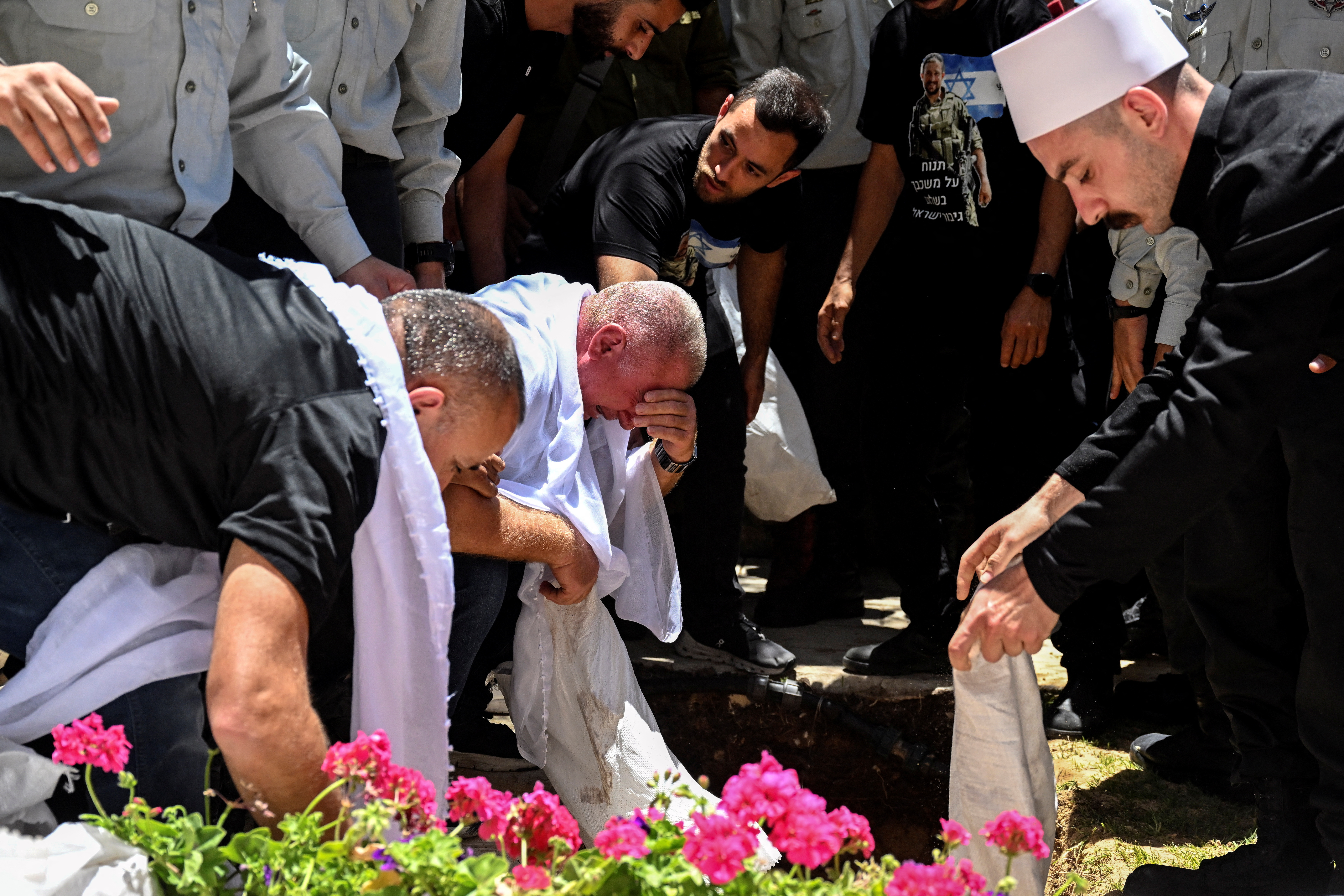 第1項,以色列士兵在以色列阿什杜德市為在以色列和哈馬斯之間的加沙衝突中喪生的以色列士兵斯坦尼斯拉夫·科斯塔列夫的葬禮後休息,2024年6月16日。路透社/馬爾科·杜裏卡