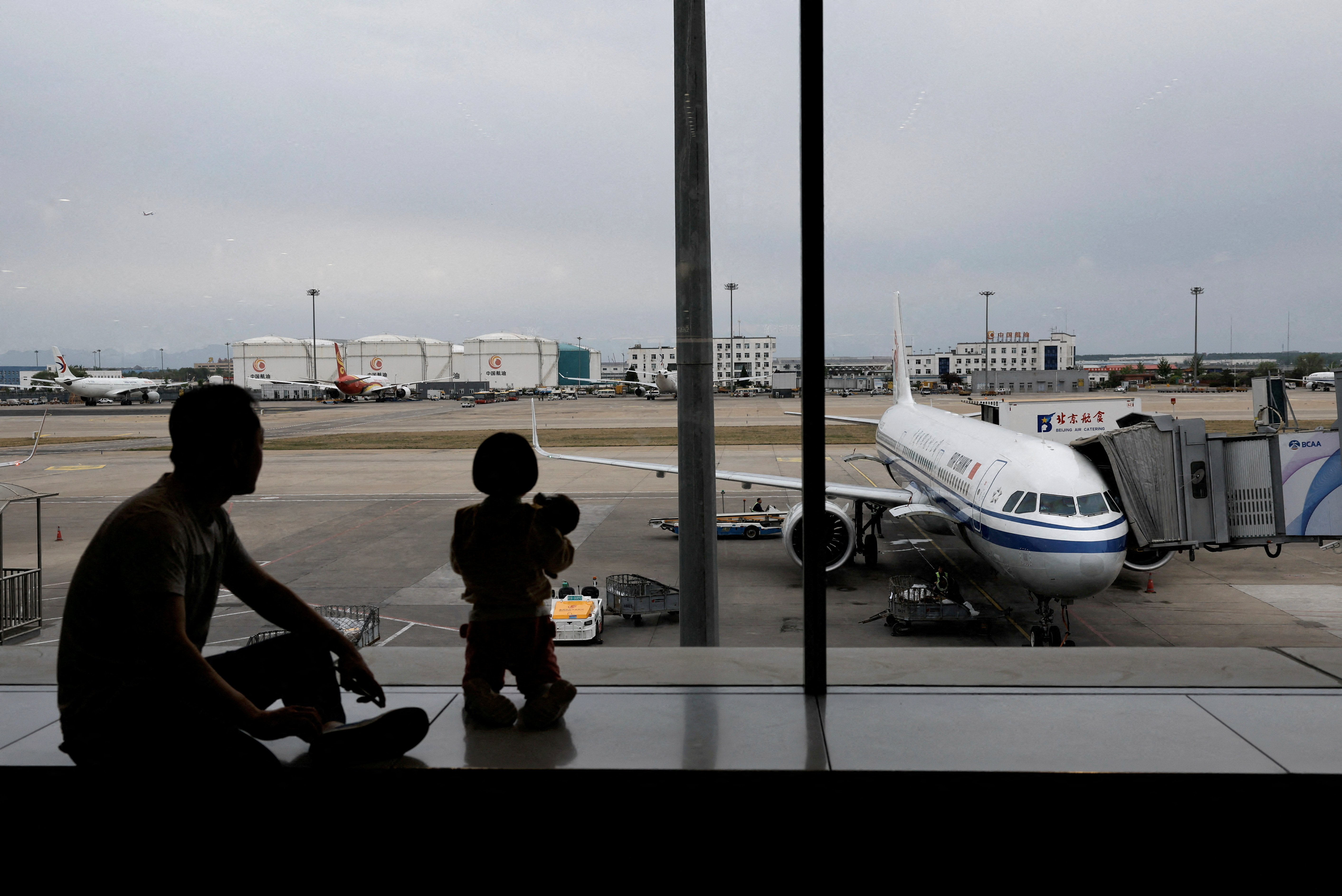 第1項,共3項 乘客們在北京首都國際機場等待飛機時看着停機坪,2024年4月20日,中國北京。路透社/王廷舒/文件照片