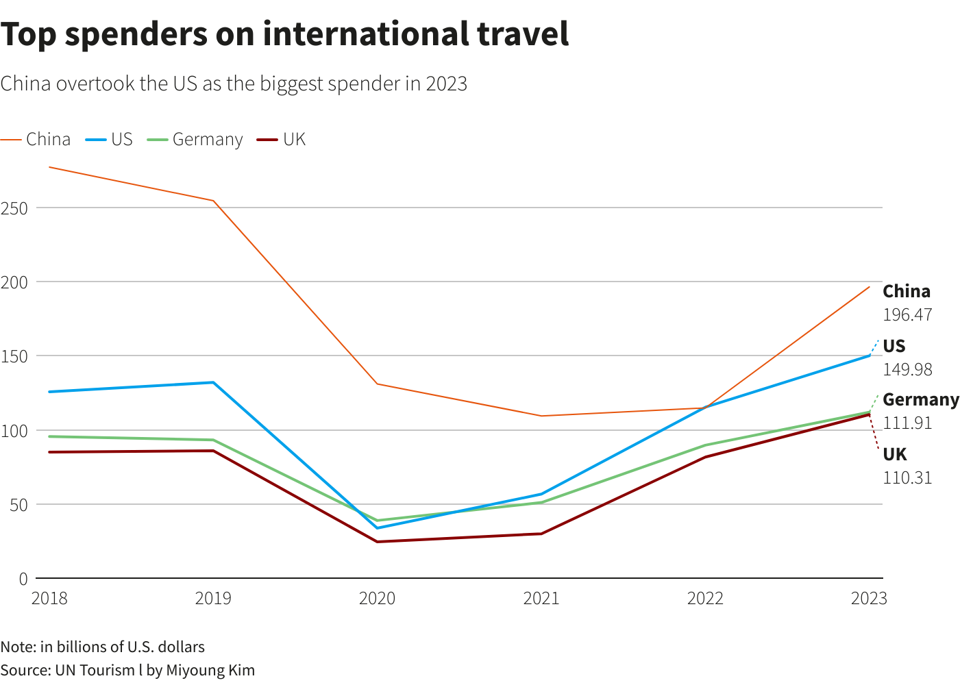 可以肯定的是,海外旅行正在復甦,根據聯合國旅遊數據,去年中國旅行者再次成為世界上國際旅遊支出最高的人羣,此前在2022年落後於美國。