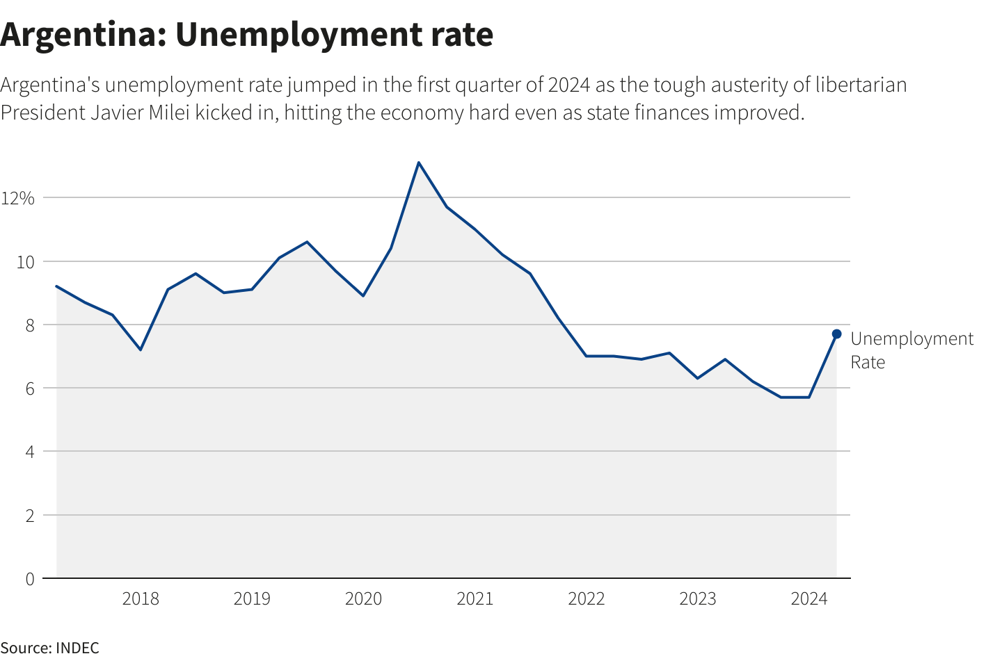 官方的INDEC統計機構還發布了就業數據,顯示第一季度失業率上升到7.7%,高於去年年底的5.7%。這意味着自上個季度以來有30萬新失業人口。