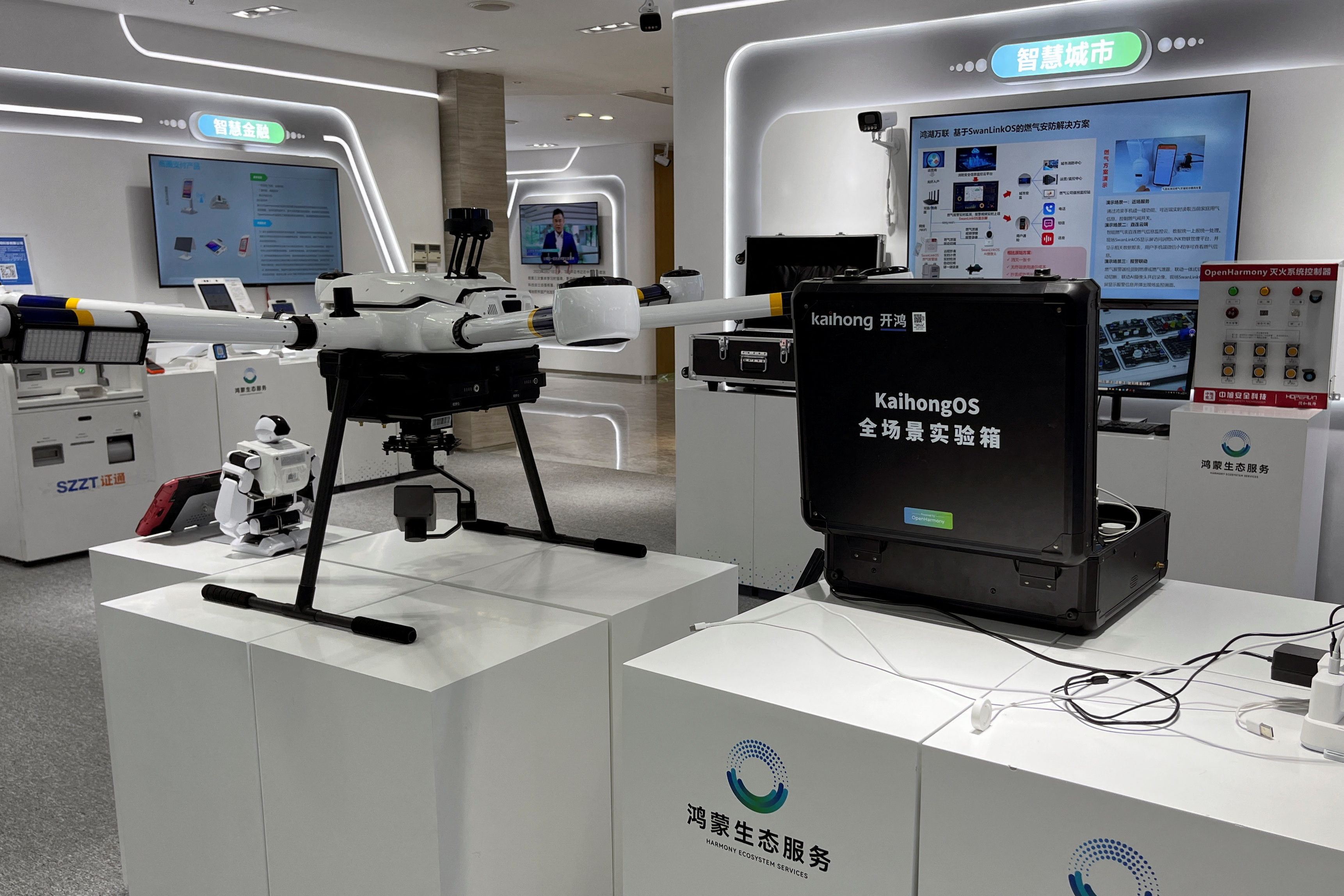 2個設備上運行的OpenHarmony,華為Harmony操作系統的開源版本,在2024年4月9日在中國廣東省深圳的Harmony生態創新中心展出。路透社/大衞·柯頓/文件照片中國深圳,2024年6月28日(路透社)- 一架無人機,雙足機器人,超市結賬機等設備被塞進一個小房間,展示了中國軟件未來的願景-一個由國家冠軍華為開發的操作系統取代了Windows和Android。