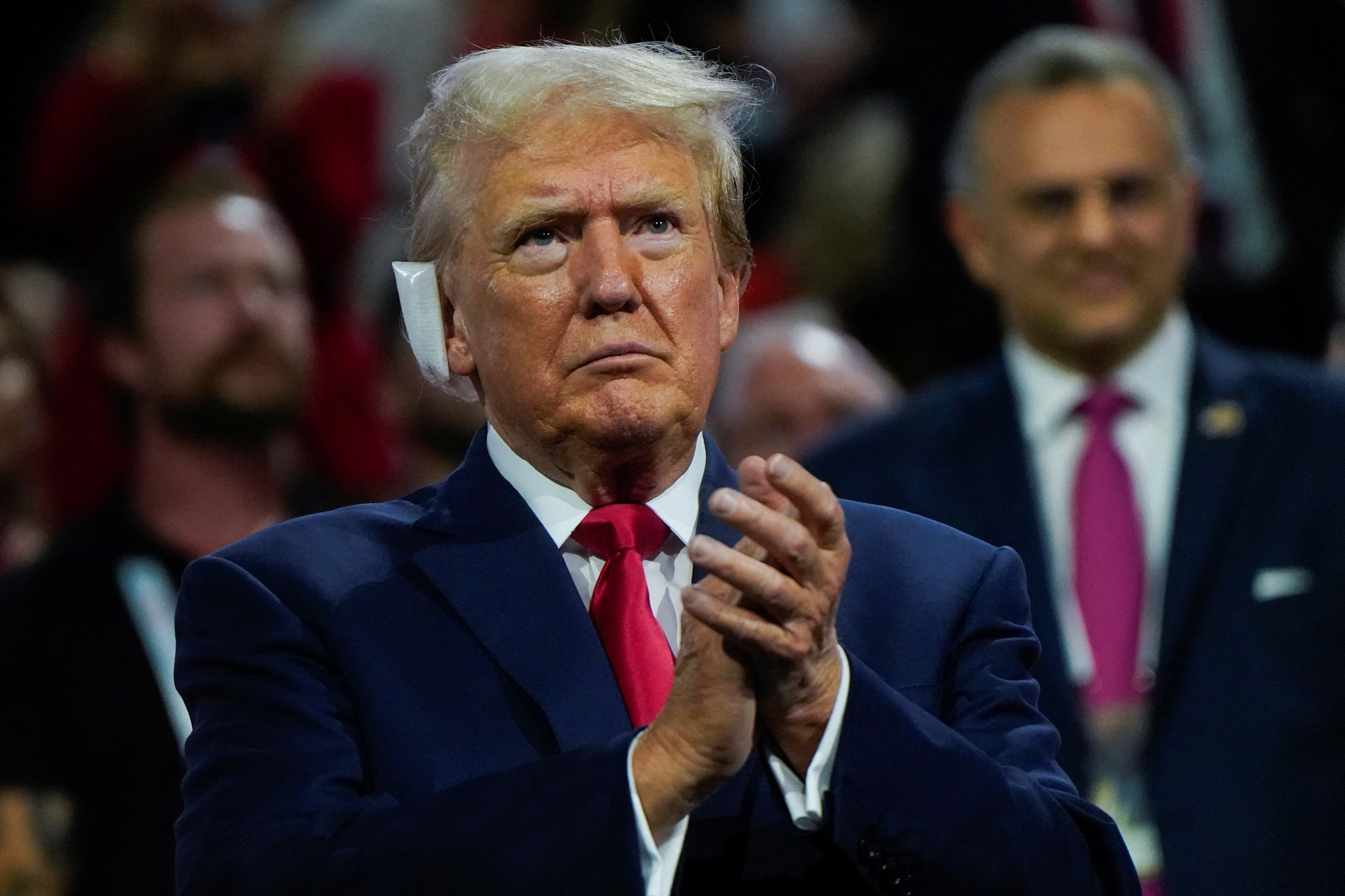 第1項共2項 共和黨總統候選人和前美國總統唐納德·特朗普在2024年7月15日美國威斯康星州密爾沃基費澤維爾論壇舉行的共和黨全國代表大會(RNC)第1天期間行走。路透社/安德魯·凱利