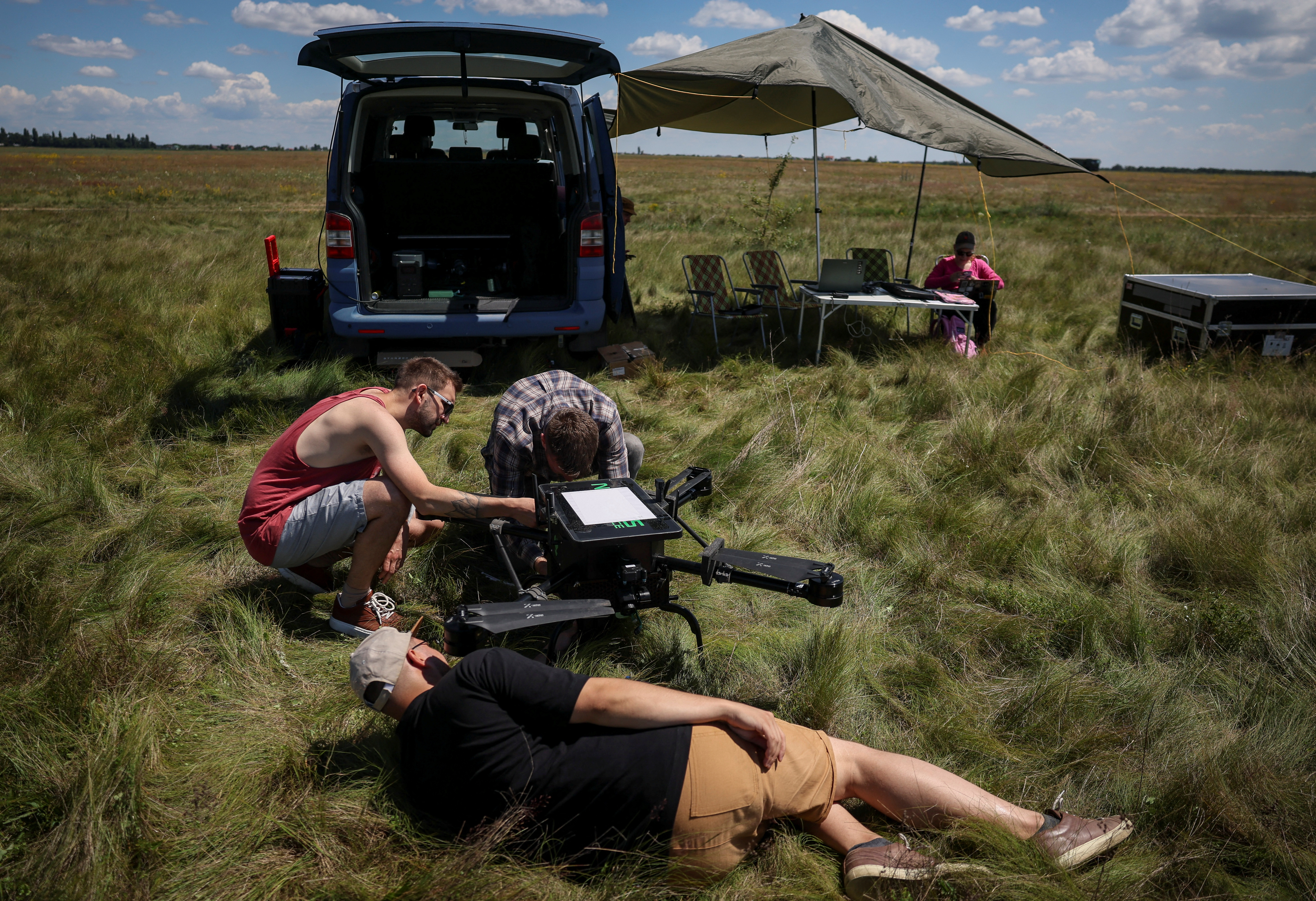 第1項5項,一隻鸛在一片田野上行走,Swarmer公司的員工正在準備AI啓用的無人機進行飛行,俄羅斯襲擊烏克蘭,2024年6月27日,烏克蘭基輔地區。路透社/Gleb Garanich/檔案照片