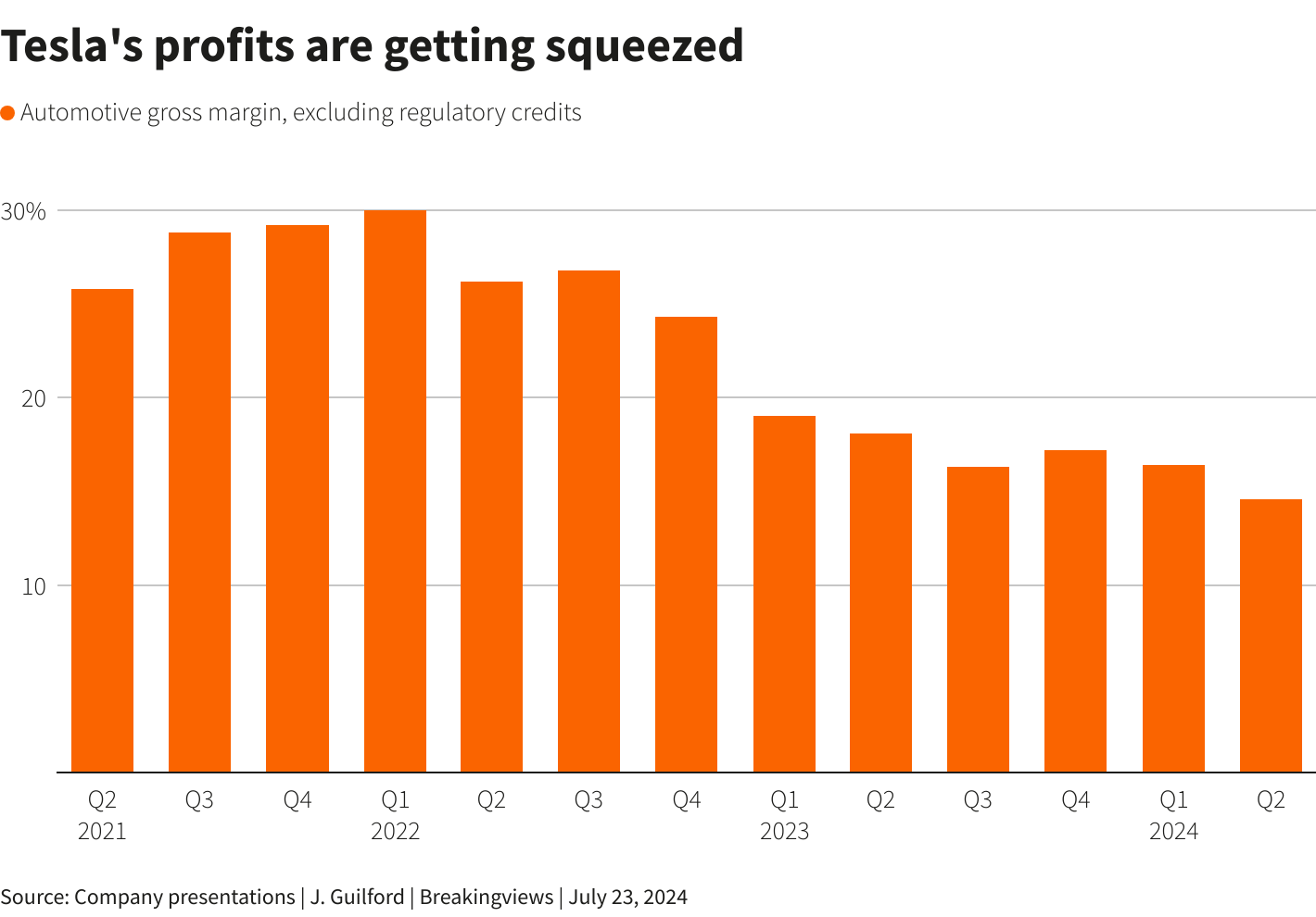 特斯拉公司首席執行官埃隆·馬斯克在中國上海的特斯拉中國製造Model Y項目開幕式上走過一塊顯示特斯拉Model 3汽車圖像的屏幕,時間是2020年1月7日。紐約,7月23日(路透社Breakingviews)- 埃隆·馬斯克有一張特朗普牌。這位7800億美元電池驅動汽車製造商的老闆支持共和黨總統候選人,該候選人誓言結束政府支持,這可能會壓縮電動汽車行業。這聽起來並不像表面那麼糟糕。撤回對電動汽車製造商的補貼將比特斯拉更大程度地擠壓競爭對手(TSLA.O)。維持其汽車業務的主導地位可能是馬斯克值得的權衡。來自底特律到深圳的競爭對手的崛起對這家位於德克薩斯州的公司並不好。與中國的比亞迪(002594.SZ)、(1211.HK)爭奪全球電動汽車銷售冠軍,馬斯克的公司已經大幅削減價格。根據第二季度業績,調整監管信用銷售後,特斯拉的汽車毛利率跌至多年來的低點14.6%。於週二揭曉,從2022年的30%峯值下降。在美國,儘管整體市場增長改善,銷售同比下降6%,根據考克斯汽車公司的數據。