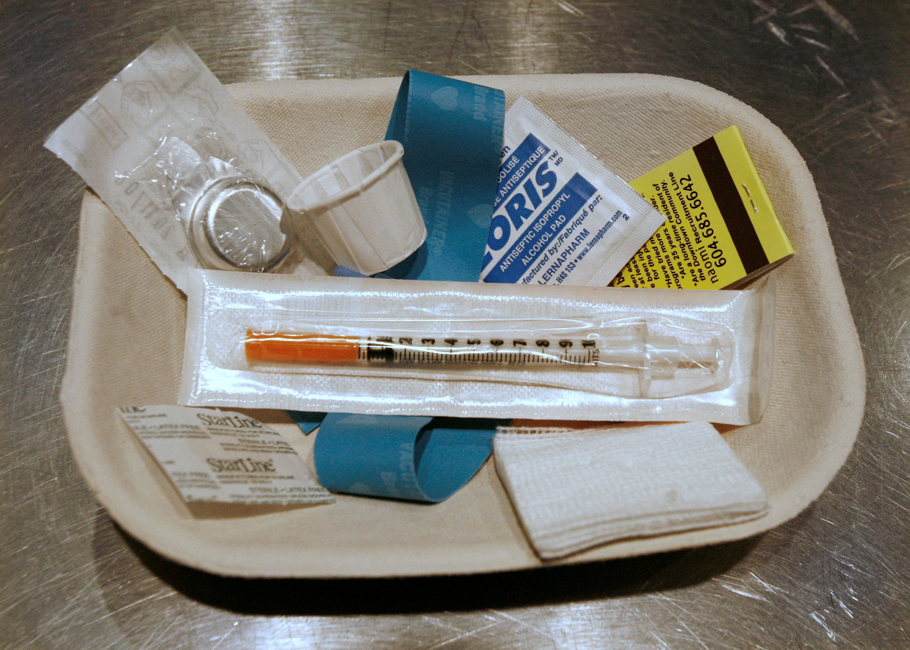 1/3 項目 一個小型供應包,包含注射器、創可貼和消毒墊,靜靜等待在温哥華不列顛哥倫比亞省東部的安全注射點被毒癮者使用,日期為2006年8月23日。路透社/安迪·克拉克/檔案照片