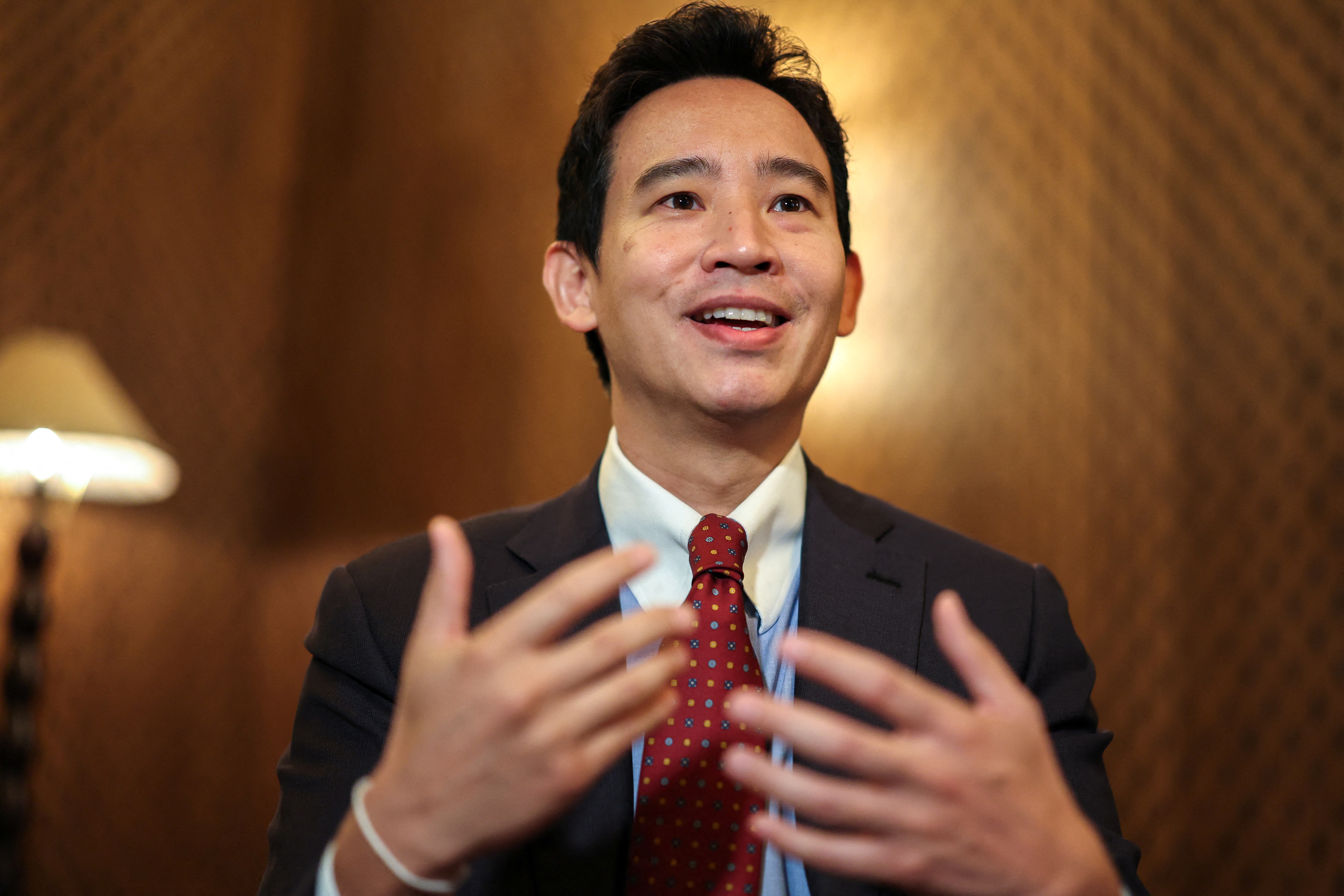 第1張圖片,共3張前進黨前領袖皮塔·林加羅恩拉在曼谷接受路透社採訪後合影,前進黨在2024年7月25日泰國曼谷等待法院於8月7日宣佈對反對派團體解散的判決。REUTERS/Patipat Janthong