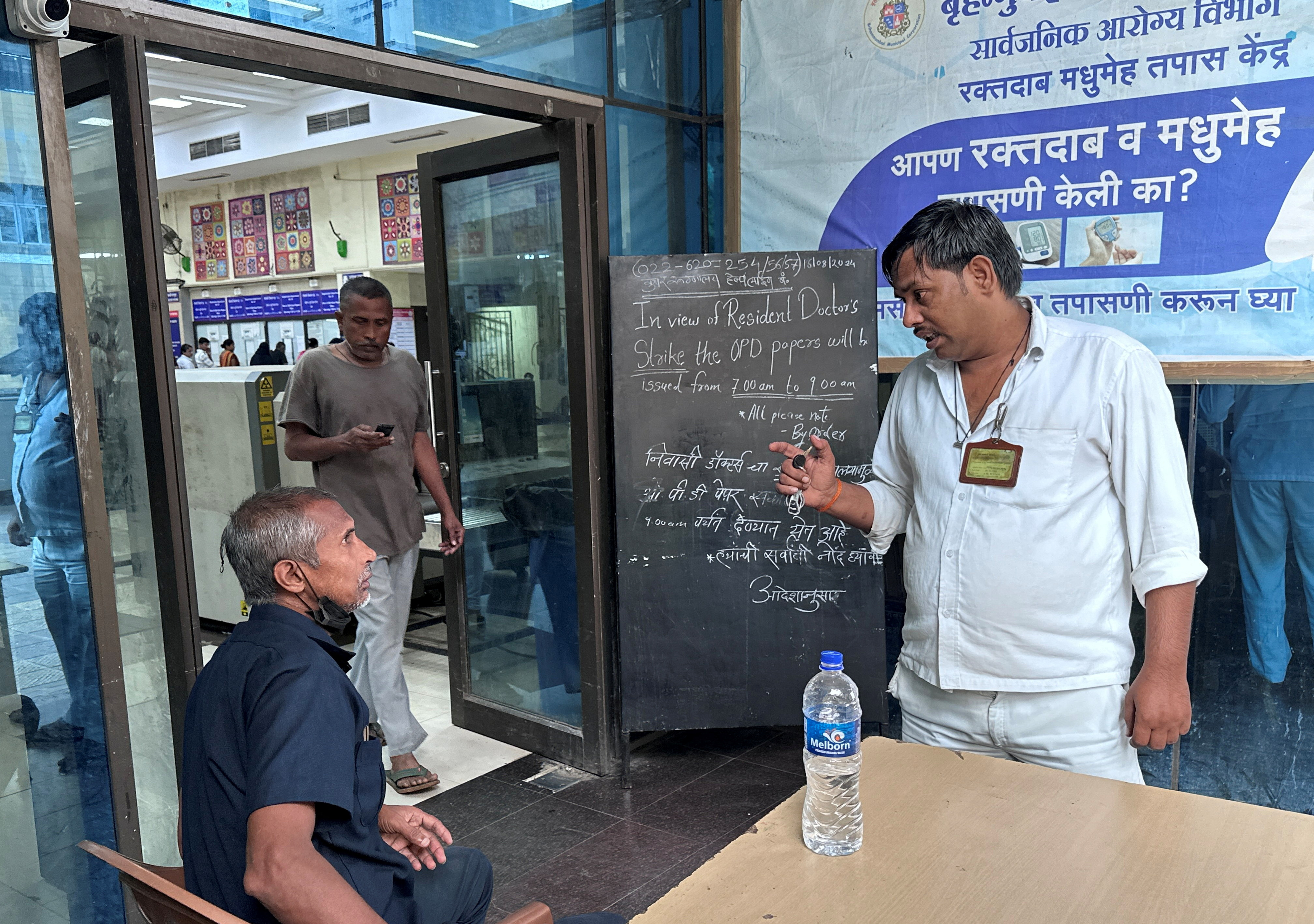 一名男子在孟買一家醫院的入口處與保安交談,詢問該醫院是否正常運營,因為印度醫學協會宣佈全國性罷工,以抗議在印度加爾各答一家政府運營的醫院中一名實習醫生被強姦和謀殺的事件,2024年8月17日….閲讀更多孟買,8月17日(路透社) - 印度醫療專業人員於週六開始在全國範圍內關閉24小時的非緊急服務,以抗議在東部城市加爾各答一名醫生的殘酷強姦和謀殺事件。