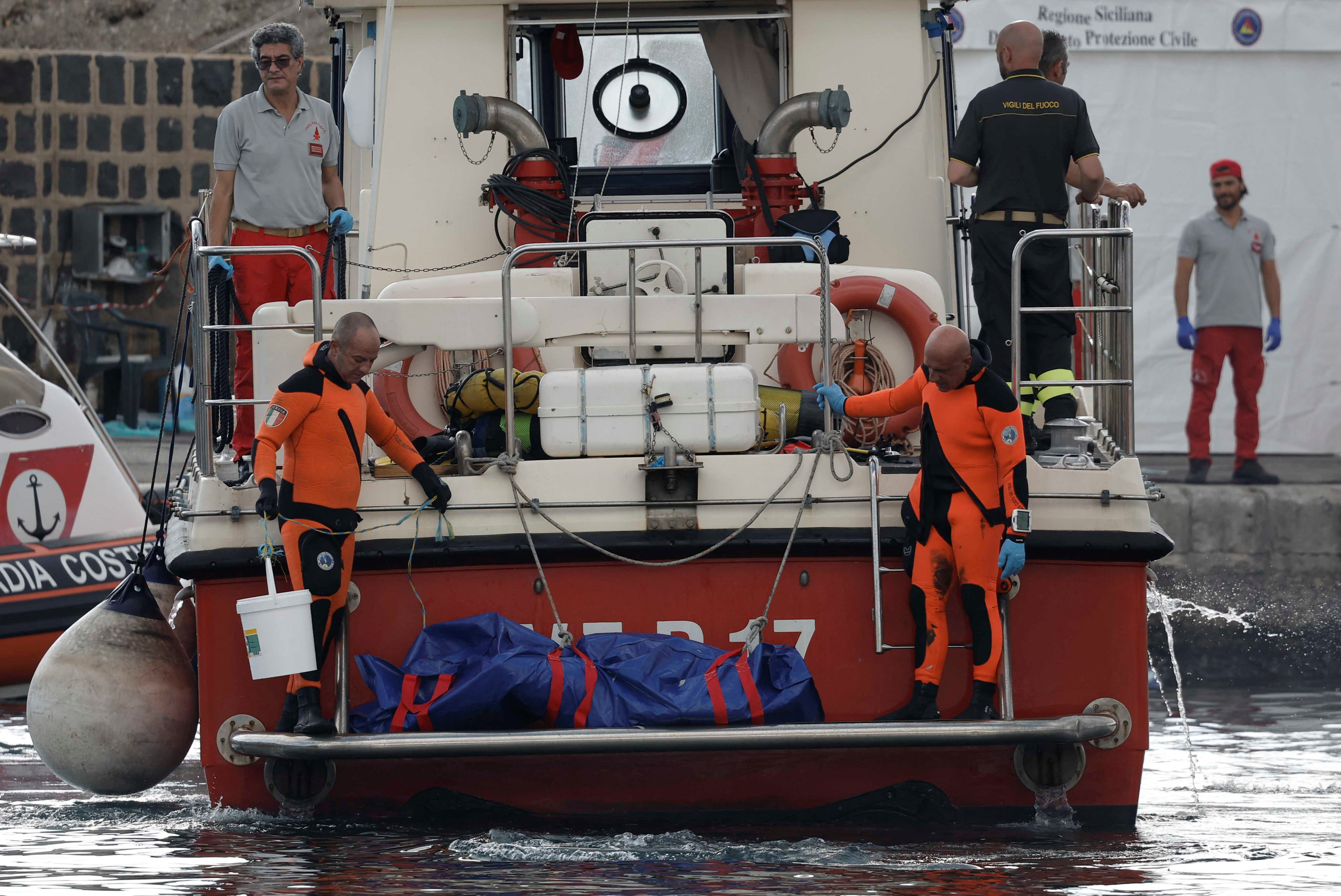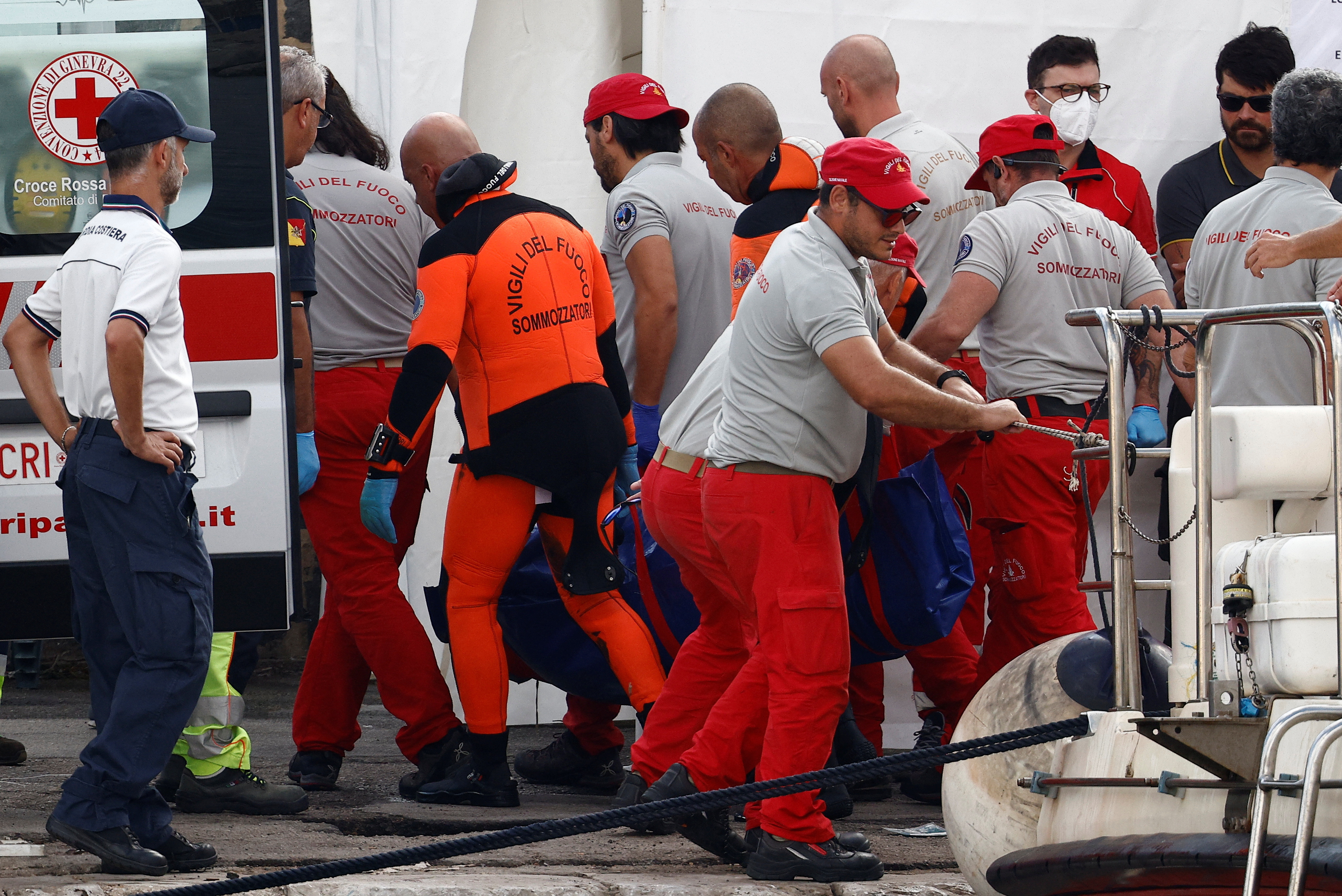 第1項,共8項 救援人員在意大利巴勒莫附近的波爾蒂切洛海岸處,豪華遊艇沉沒現場搬運一具屍體,日期為2024年8月22日。路透社/古利爾莫·曼賈帕內