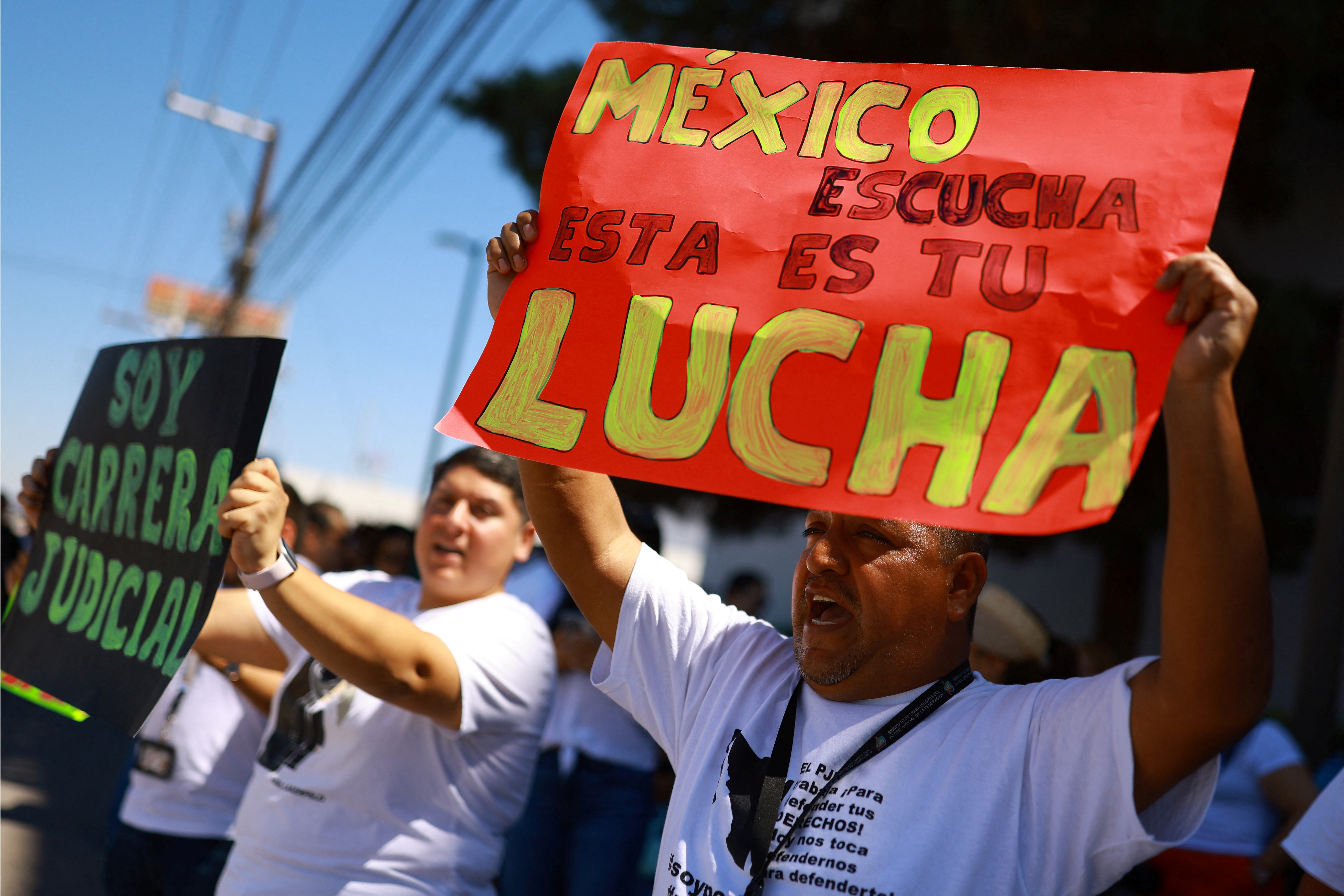 第1項,共3項 聯邦司法部門的員工在全國範圍內進行無限期罷工,抗議立法者對國家司法改革的投票,包括將法官的選舉改為民選,地點在墨西哥華雷斯市的辦公室外,時間為2024年8月21日。路透社/何塞·路易斯·岡薩雷斯。