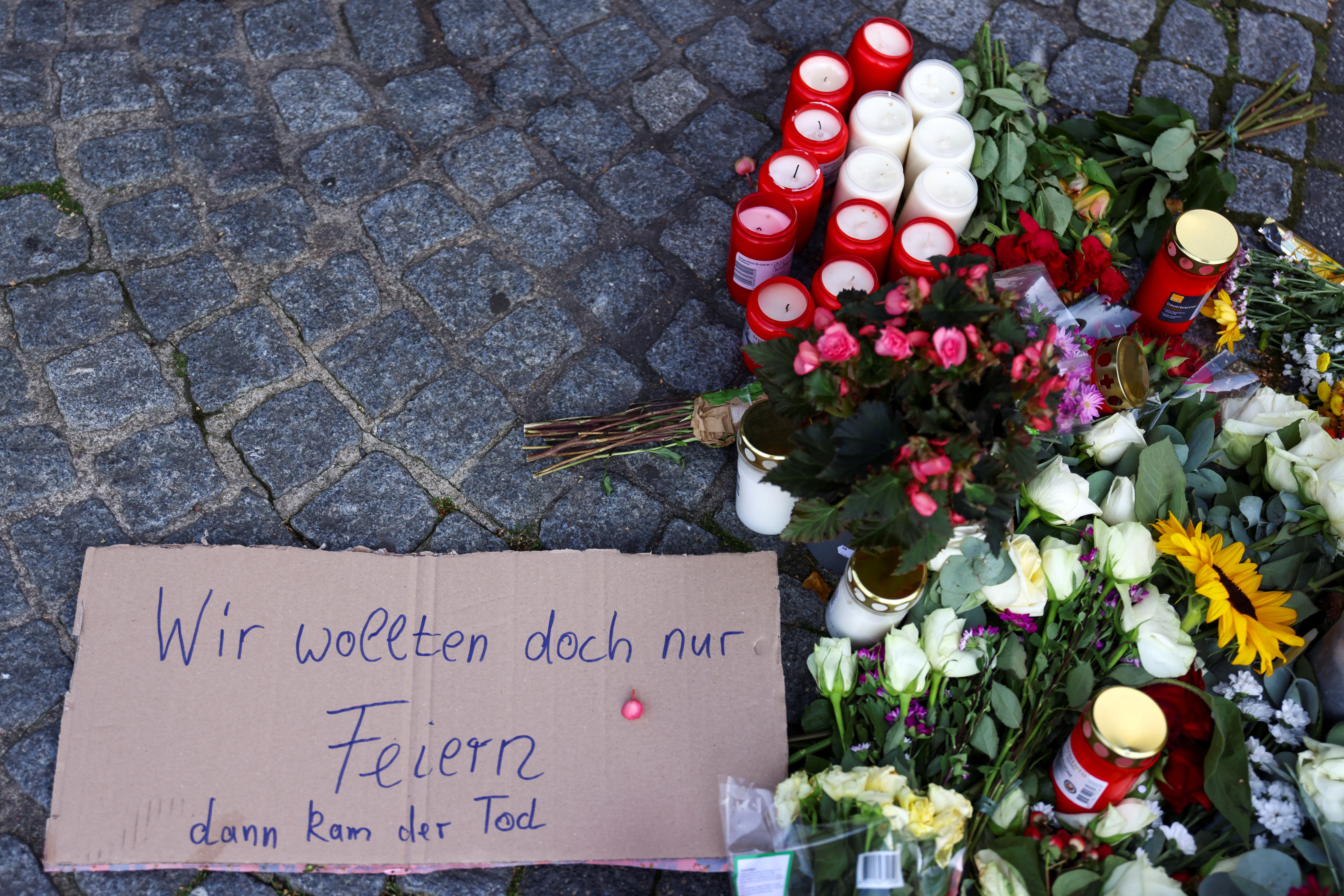 一塊寫着:“我們只是想慶祝,但死亡降臨了”的標誌放置在花朵和蠟燭旁邊,此次事件中幾名個人在德國索林根市的一個節日上被一名男子隨機用刀刺傷致死,發生在2024年8月24日。路透社/蒂洛·施穆爾根8月24日(路透社)- 伊斯蘭國組織週六聲稱對週五在德國西部城市索林根發生的刀襲事件負責,該事件造成三人死亡。