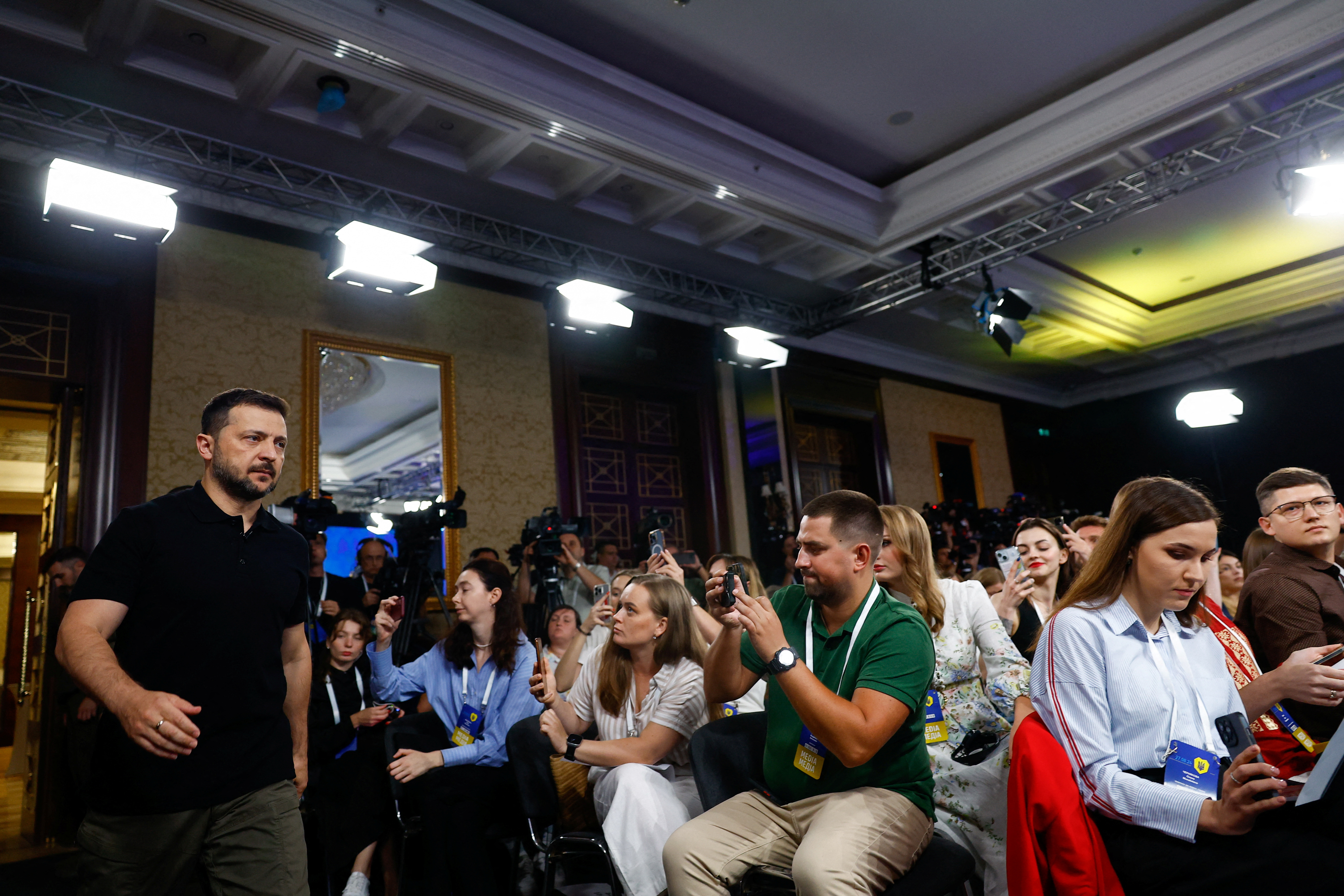 烏克蘭總統弗拉基米爾·澤連斯基在烏克蘭基輔舉行新聞發佈會,期間俄羅斯對烏克蘭的攻擊,2024年8月27日。路透社/瓦倫丁·奧吉連科