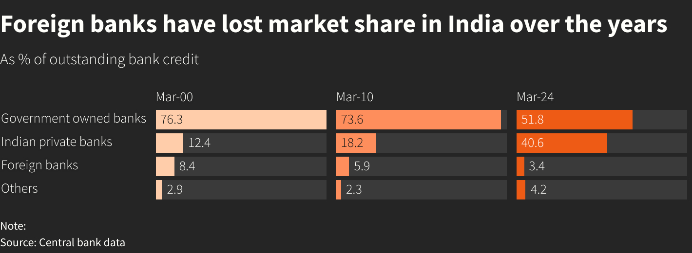 儘管有這些吸引力,但與資本要求和所有權限制相關的更嚴格規則,以及政府支持的銀行幾乎佔銀行信貸的52%的國家主導地位,給外國銀行在印度的運營帶來了壓力。