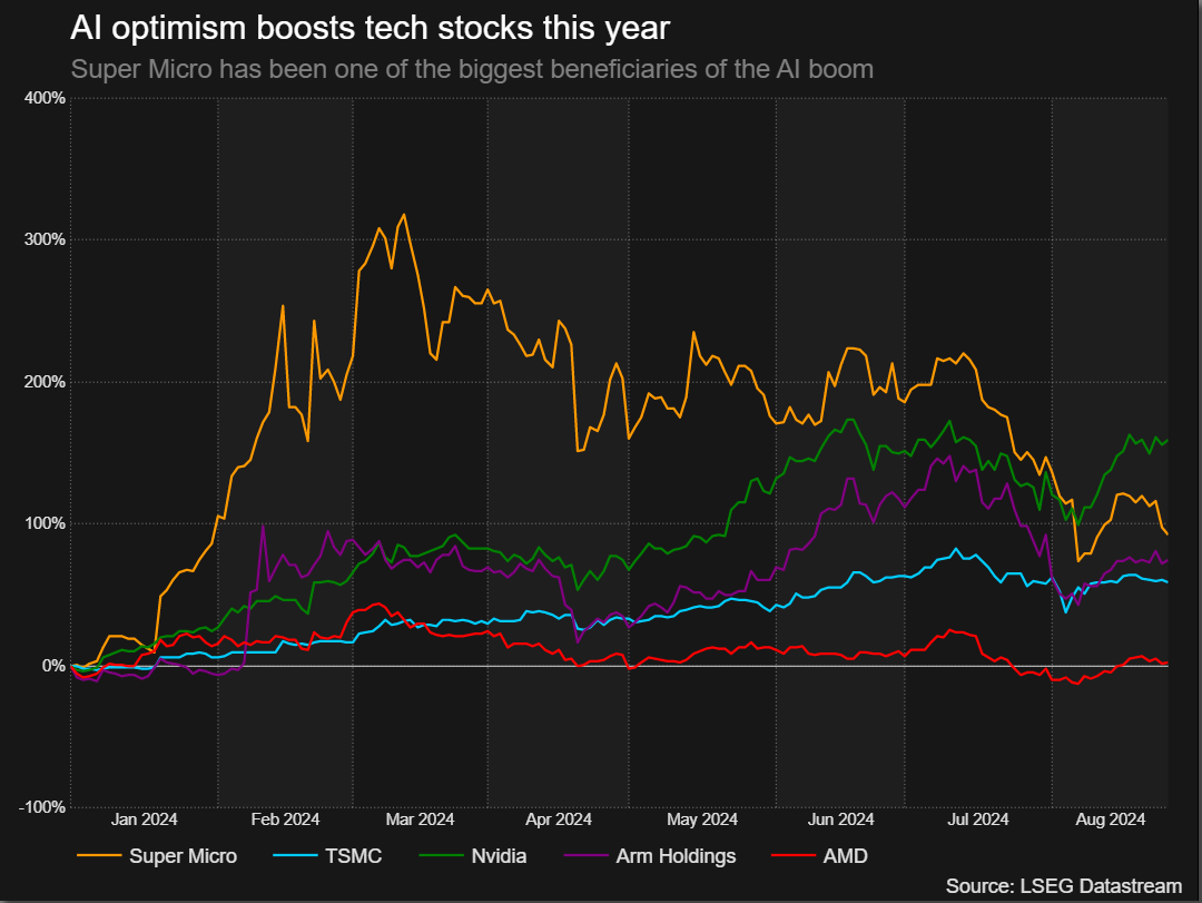 超微表示,它沒有更新本月早些時候宣佈的截至6月30日的財年和季度的結果。由於服務器生產成本上升以及包括戴爾在內的競爭對手的價格競爭,該公司季度利潤率出現下降。(DELL.N).超微在生成性人工智能熱潮中成為了一個大贏家,因為企業押注於推動像ChatGPT這樣的應用所需的技術。自2023年初以來,該公司的價值激增,從大約44億美元的估值上升到3月的670億美元峯值,之後又有所回落。